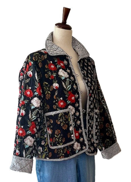 Luxe Cotton Quilted Womens Jacket With Stripe Piping Looks Rich (Black Floral)