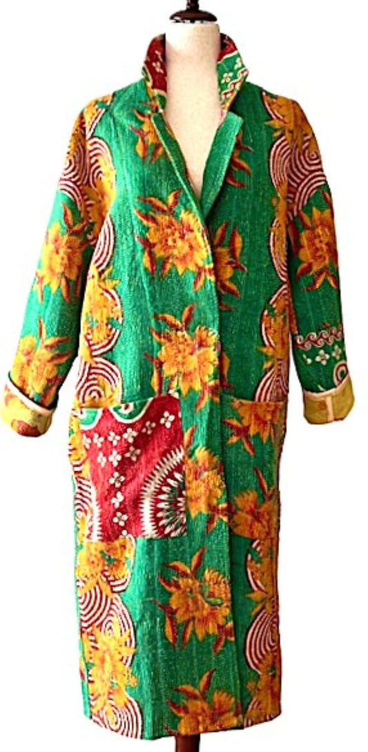 Jacket - Wearable Art, Long Boho Quilted Patchwork Coat Is A Statement Piece (Green Floral)