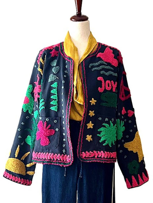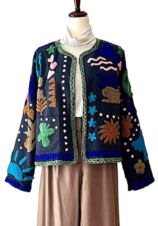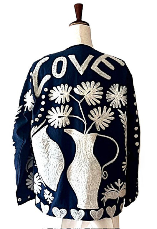 Jacket, Wearable Art In This Hand Embroidered Short Contemporary "Love" Jacket. (Navy)