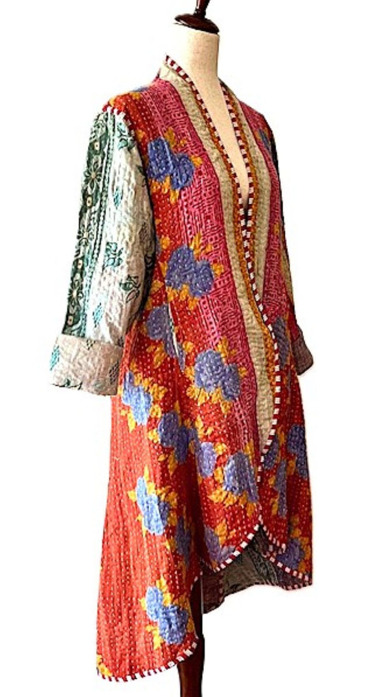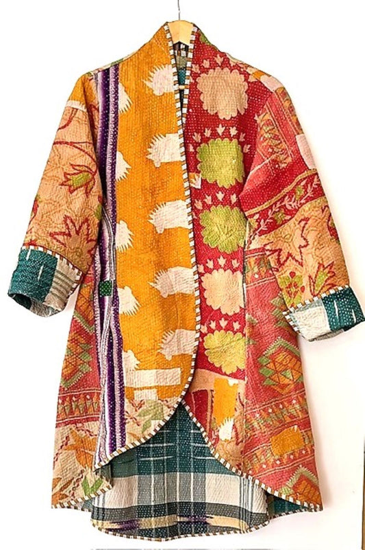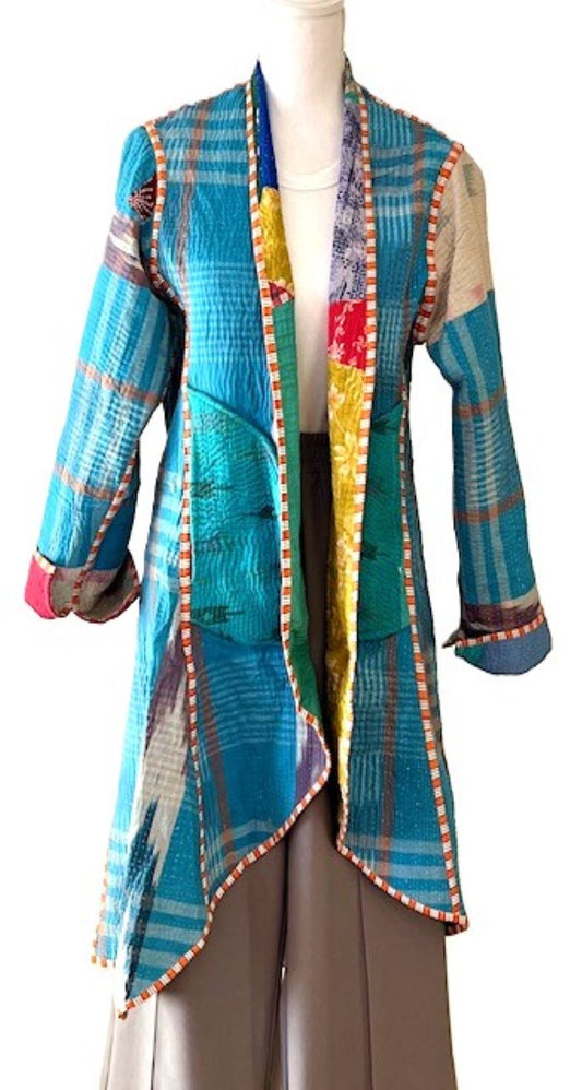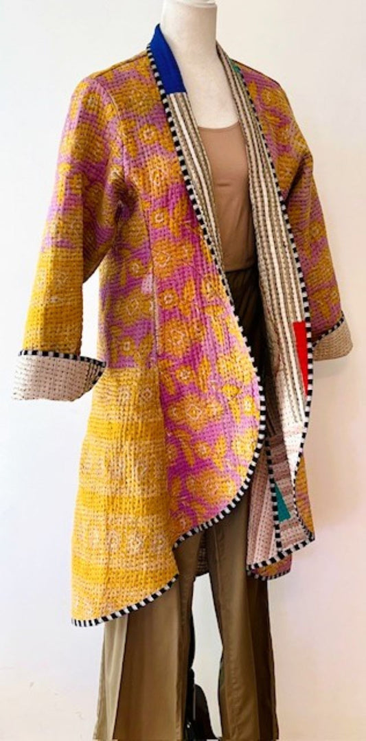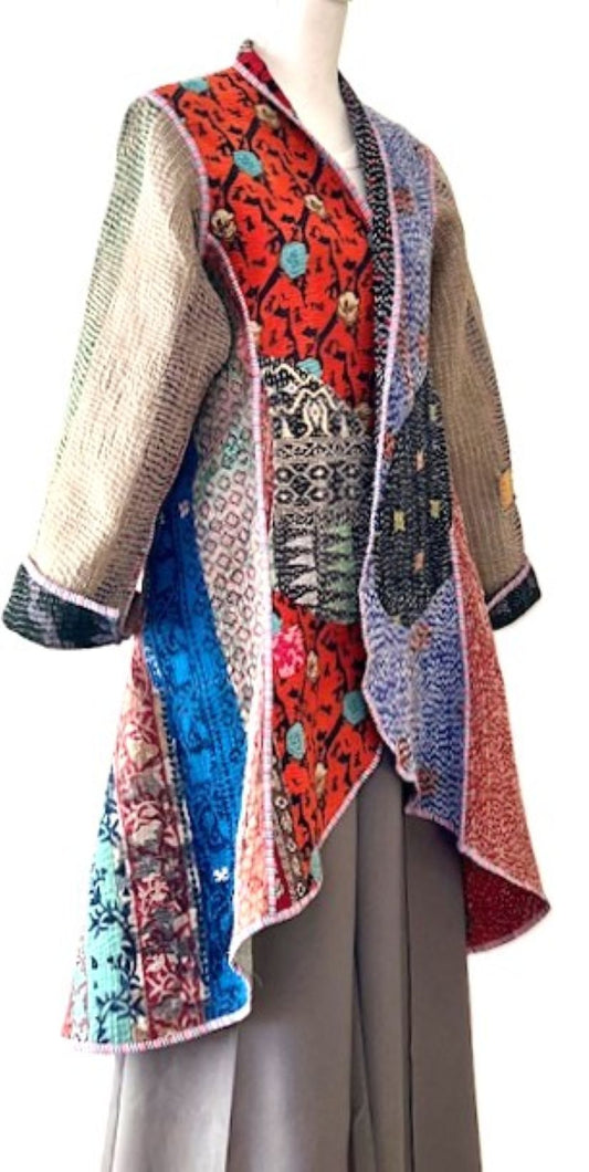 Wearable Art: Handmade Kantha Stitched Multi ColoredJacket. Swing Cut, Pastel