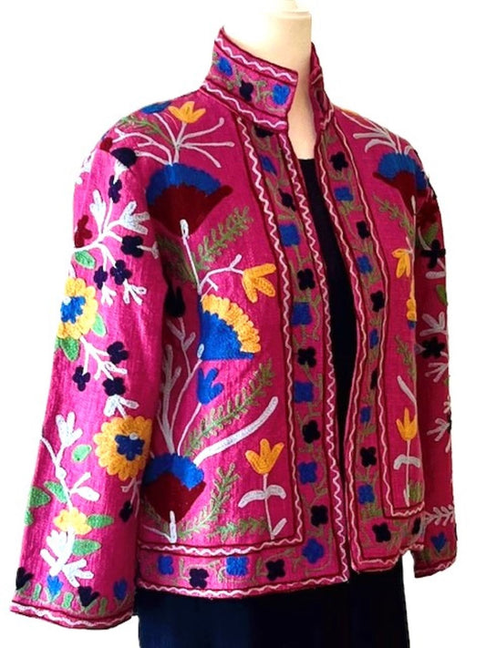 Wearable Art In This Hand Embroidered Short Jacket. (Fuschia)
