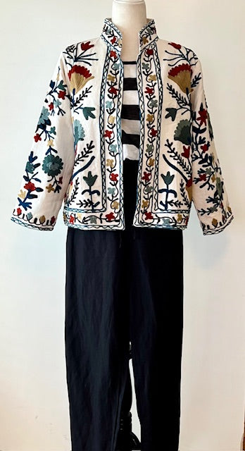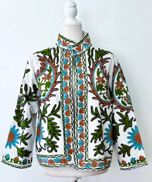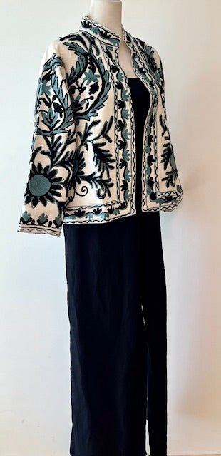 Wearable Art In This Hand Embroidered Short Jacket. (White w/Blue & Black)