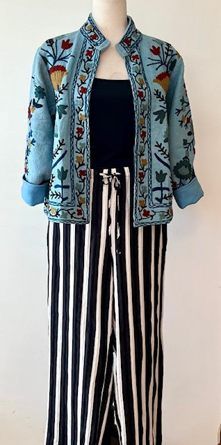 Wearable Art In This Hand Embroidered Short Jacket. (Light Blue)