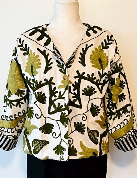 Wearable Art In This Hand Embroidered Short Jacket. (Olive)