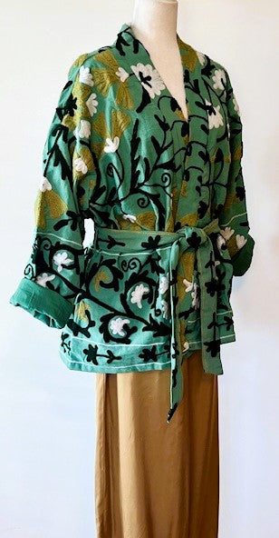 Wearable Art: Hand Embroidered Short Jacket Wtih Belt In A Luscious Shade of Green