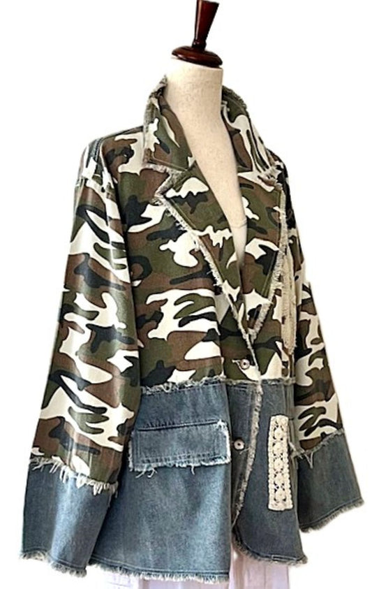 Long Sleeve Patchwork Camo Jacket With Woven Lace