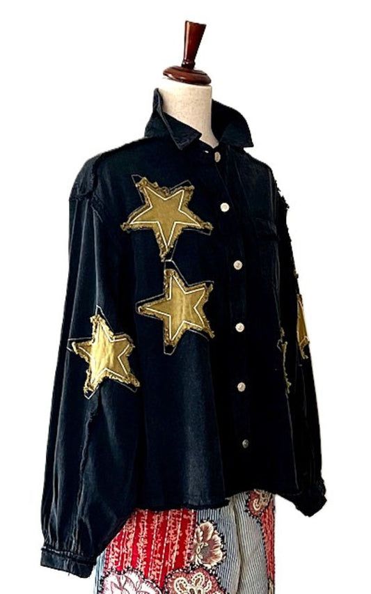Slimmed Down Long Sleeve Black Denim With Stars Shacket