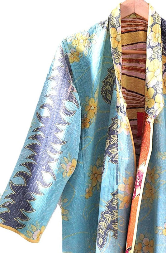 Jacket - Wearable Art, Kantha Embroidered, Fully Reversible Boho Kimono: Handmade (Blue)