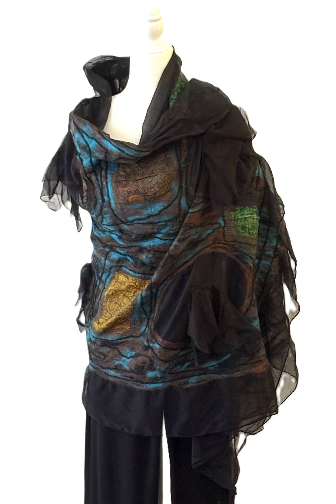 Beautifull contrasting silk pieces are woven between colorful felted wool and chiffon. Unique, collectible, and versatile. Each scarf is one-of-a-kind. Truly wearable art. The felted wool is delicate, light, and provides body to the silk. Brilliant concept.