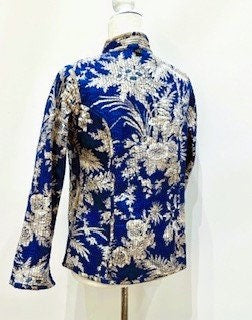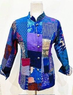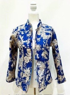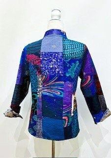 Reversible Cotton Quilted Womens Jacket With Stripe Piping is adorable. Handmade, quilted, patchwork pattern, button down front. Styled in a short blazer jacket resting just below the waist. Long sleeves with split seam, fold back to expose the cute piping, adjusting the sleeve length. Nice designer detailing. Each jacket is unique and one-of- a- kind.