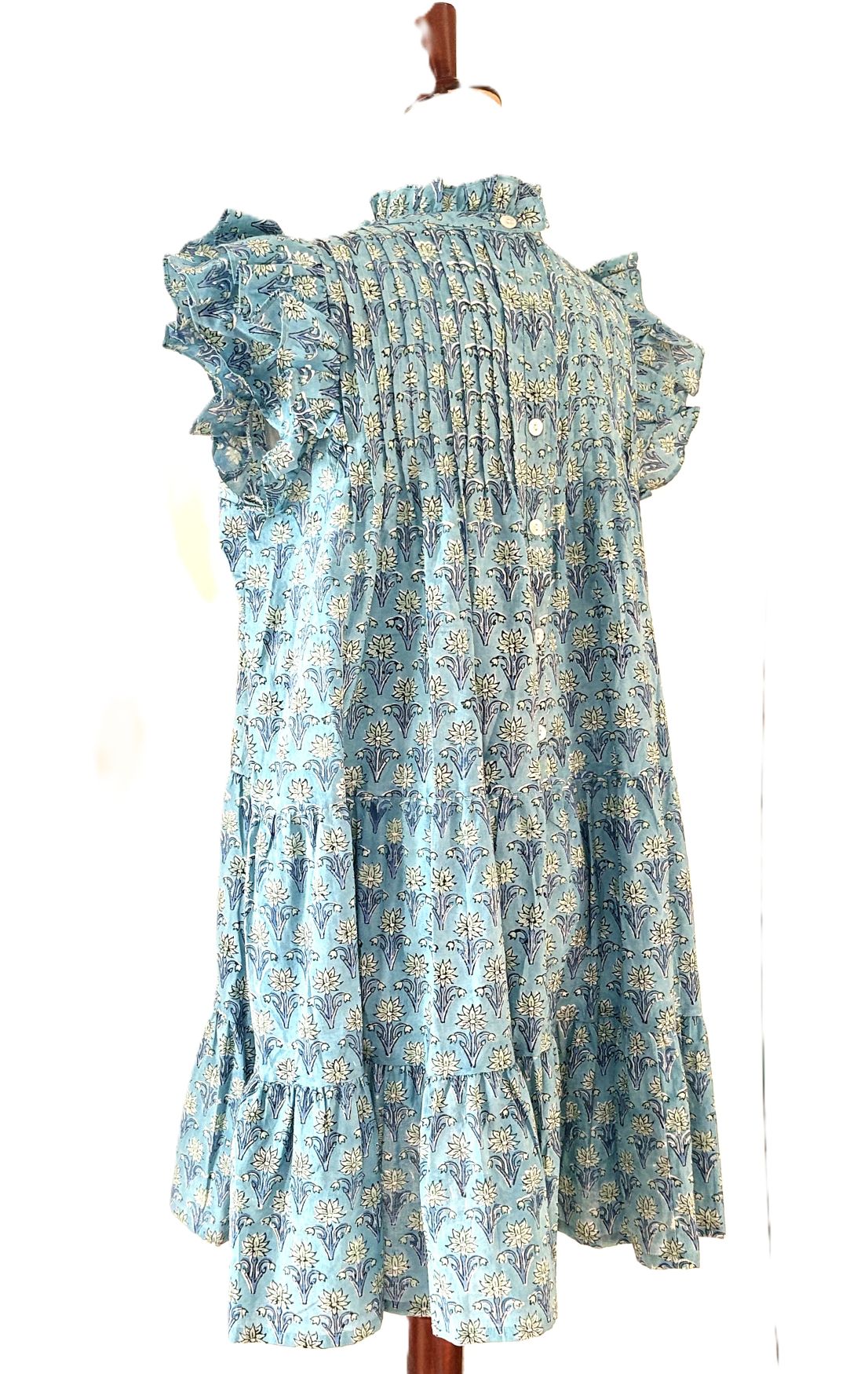Block Print Dress With A Short Flutter Sleeve Is Smart. This beauty is block printed and handmade. Knee length, round neck, empire bodice. Front placket, pin tucked pleated bodice, front buttons completes at the empire. Fitted bodice with a flattering A-line cut skirt with gathered tiers. Fabric is pure Indian premium cotton, soft and breathable. The silhouette is free , flowy and slightly A-line. It is beautiful for all body types and perfect for casual wear.