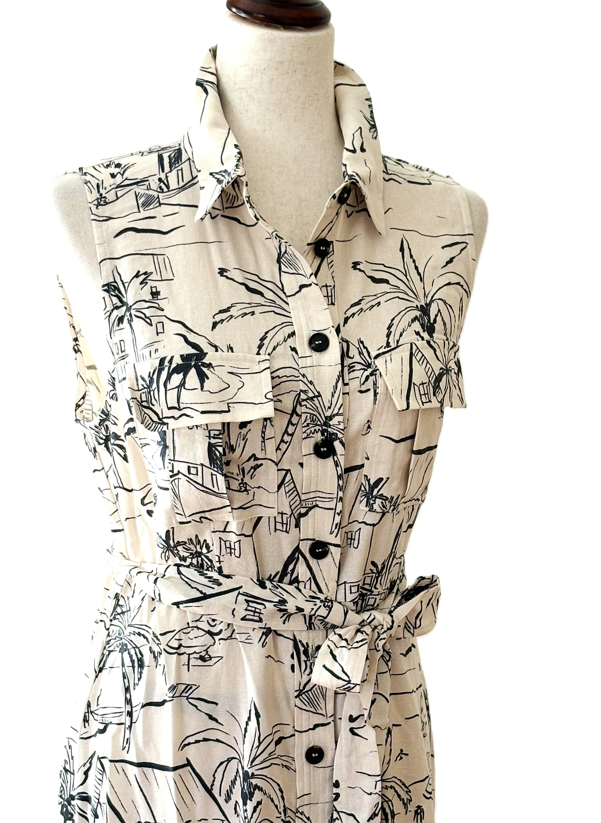 Sail Away with Me Sleeveless Shirt Dress is smart and chic. This tailored dress is perfect for office, lunch, resort, and casual outings. Collared neckline, front button closures following a slit for movement. Two box pleated pockets are on the chest, sleeveless cut-in adds a designer element to the silhouette. A-line cut, soft fabric self-tie sash belt. Linen blend provides shape and body to the garment. Side slits provides ease and movement. Clever print of palm trees, sailboats, and beach huts sets the stage for a summer fling. A classic cut, print, and color guarantees years of wear.