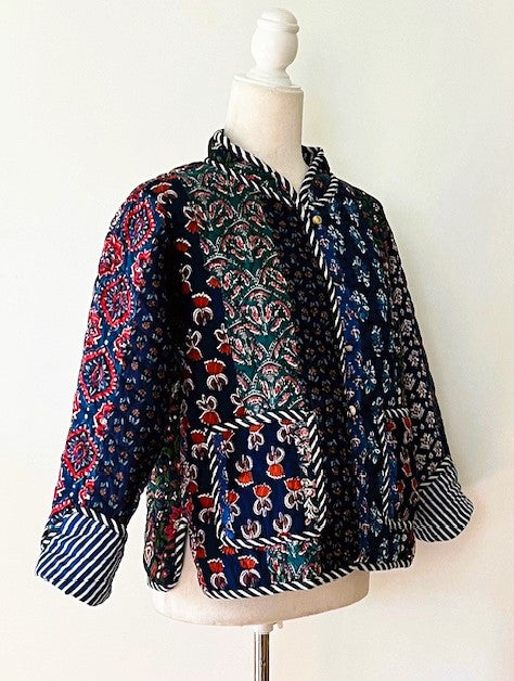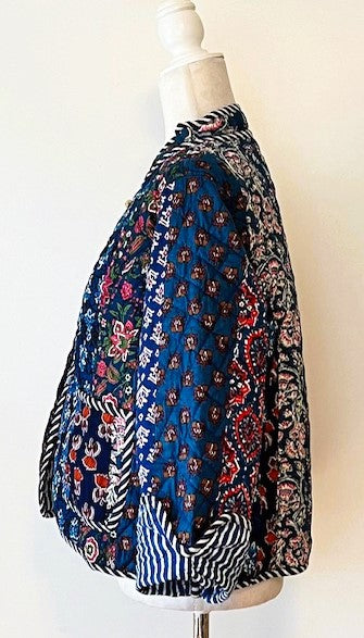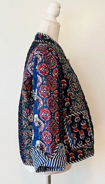 Patchwork Cotton Quilted Womens Jacket With Stripe Piping Looks Rich. This reversible cotton quilted jacket looks so rich in the deep lush navy tones. The stripe piping balances the jacket in royal blue. Handmade, quilted, patchwork pattern, button down front. The mix of patchwork prints brings depth to the garment and will carry the jacket into Fall and Winter. The contrast piping stands out against the dark tones. Beautiful. Styled in a short blazer jacket resting just below the waist. Long sleeves with split seam, fold back to expose the mixed print and piping, adjusting the sleeve length. Nice designer detailing. Each jacket is unique and one-of- a- kind.