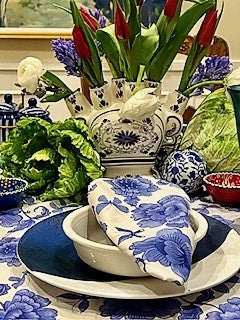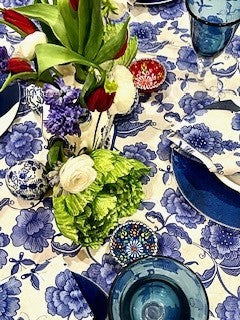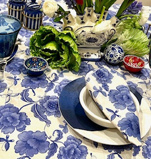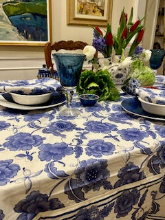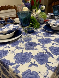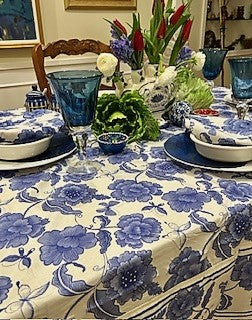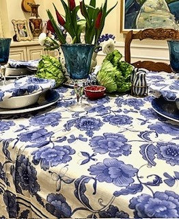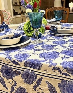 Smart Navy and White Print Table Cloth (60x90) is exceptional. What a great color combination. Floral patterrn is hand screen printed. The rich engineered striped banded border softens the print, adding a designer element. Year round use.