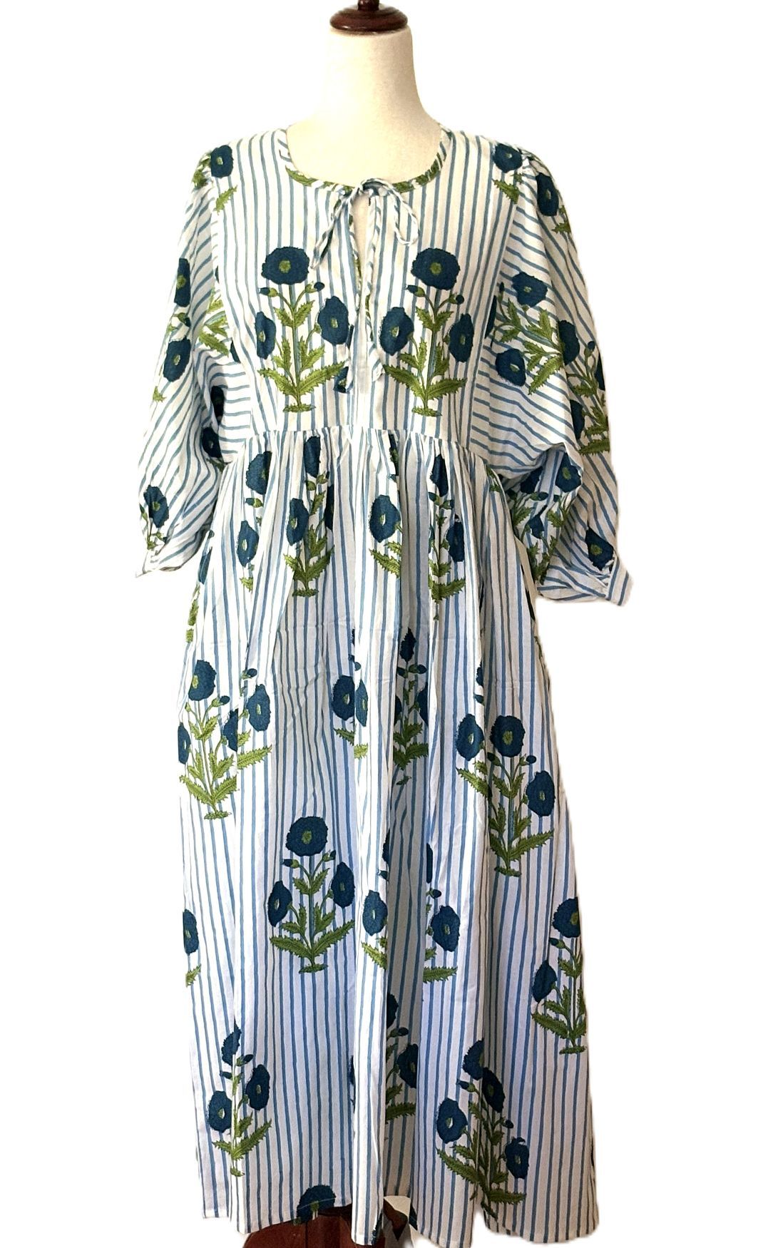 Cotton Block Print Midi Dress Is Delightful In A Blue Stripe Floral This simple tailored dress has a round neck, key hole neck with tie front, empire waist, elasticized 3/4 sleeves, with an A-line cut. Feminine, flattering, fit and flare. High quality cotton with a soft touch, hand printed pattern, and exceptional craftsmanship. This is a dress you can where to the office, lunch, brunch, and even an evening out. A refined piece, in a classic design tailored will last for years. Flattering to all body types.