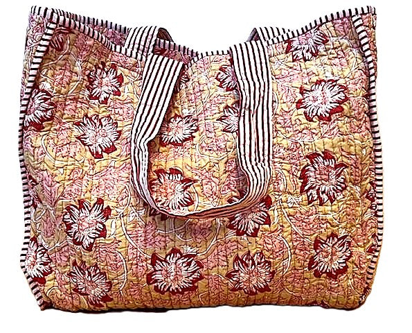 These cotton quilted bags are totally unique and serves multiple purposes. Use as a light weight tote as a secondary bag for papers and lap top, great for beach or pool, groceries, travel bag, overnight bag and even as a diaper bag. Perfectly suited for almost all you needs.