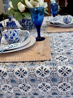 Great skill and precision is required for the artist to create these fine hand block prints, and the natural variations that occur with hand block printed textiles; adds to the authentic beauty of each piece. Hand printed with vegetable dye is sustainable, environmentally friendly, and improves with use. Cloth is a complex print of navy and white, beautiful, well positioned border. Seasonless, flowers and crockery will set the stage. Entirely handmade. This is a cloth that you will use for years, create beautiful Tablescapes, and enjoy fond memories and food with family.