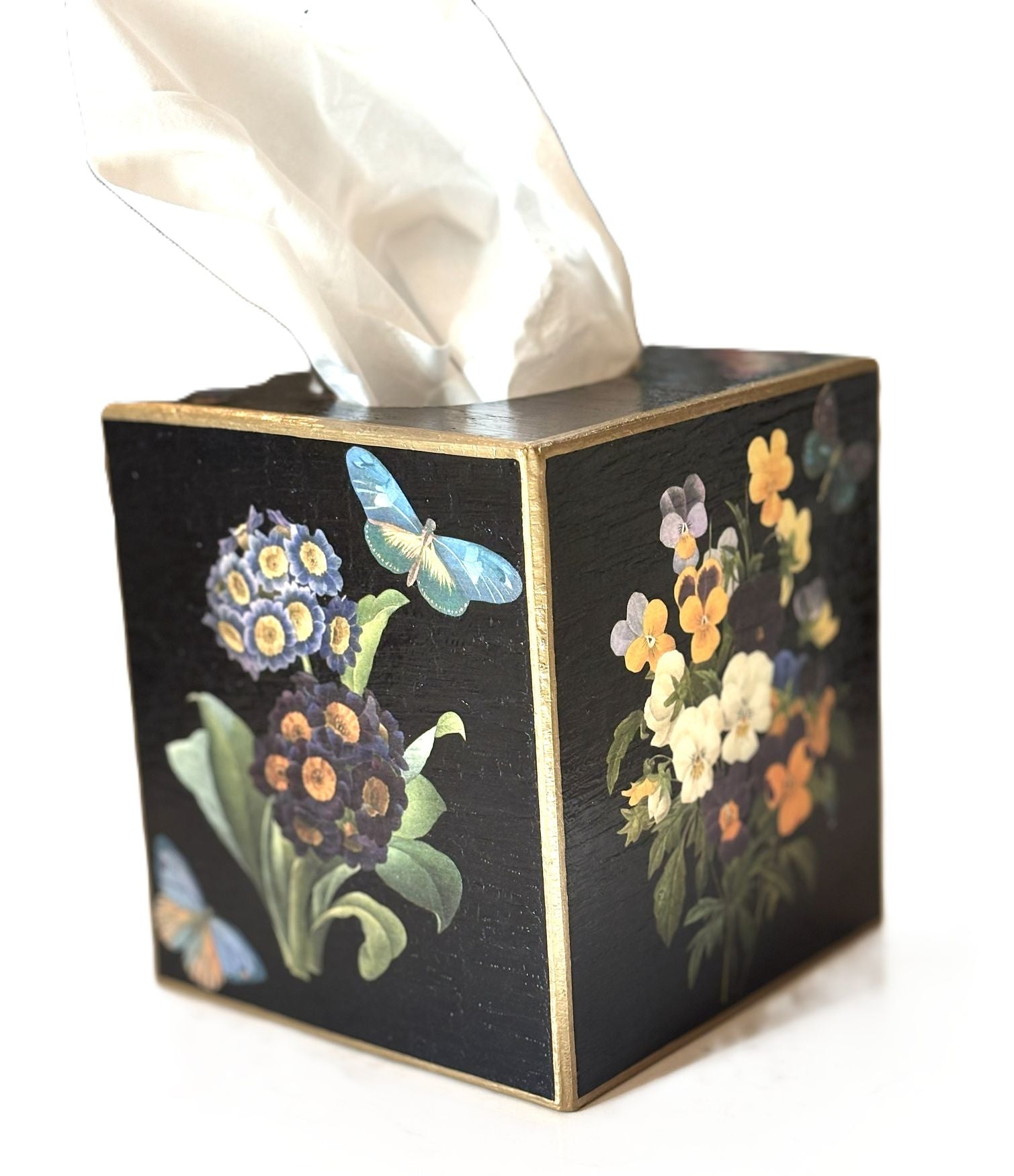 Finishing touches to your home decor, these decoupage tissue box covers are handmade to order in the USA. Recognized and featured in numerous magazines, People, Elle, House Beautiful, and Southern Living. They easily slide over any cubed tissue box cover. The artwork is hand-cut, decoupaged, and polished. Each tissue box cover is hand painted in gold or silver around the edges as the finishing touch.