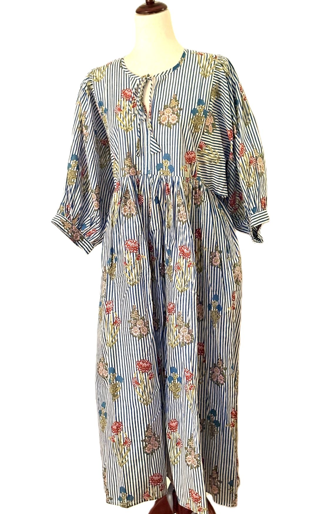 Bouquets And Stripes Cotton Midi Is A New Spin. Made of soft cotton gauze, the dress drapes so elegantly on the body. Loose, yet defined silhouette is so appealing. The 3/4 sleeves are gently gathered, finished with a sewn cuff. This classic silhouette has been slimmed down yet still generous. A-line cut, string closure and two side pockets. We find the multi colored bouquets create a warm, fresh look.