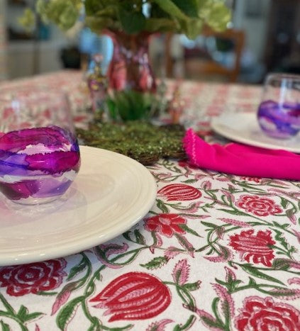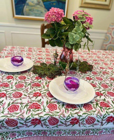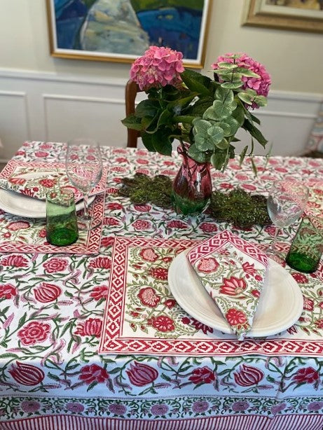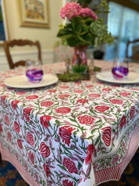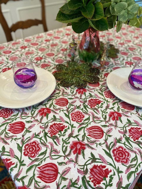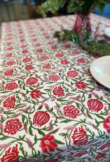 Indian Handmade Block Printed Flowers Printed Fabrics Cotton Table Cover Made With Multi colors. Christmas Red on white background with pink accents.