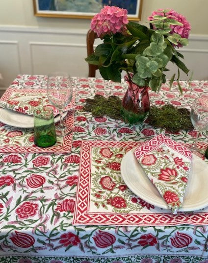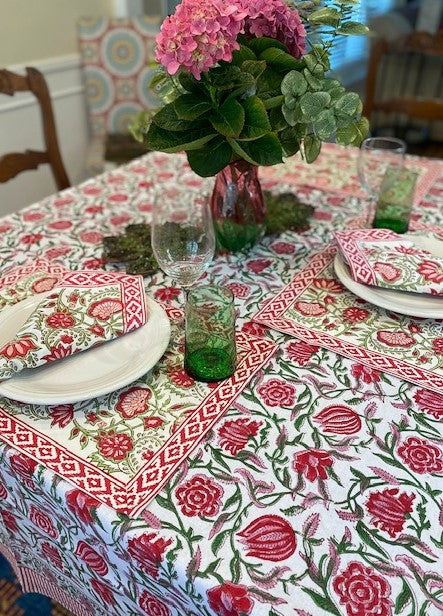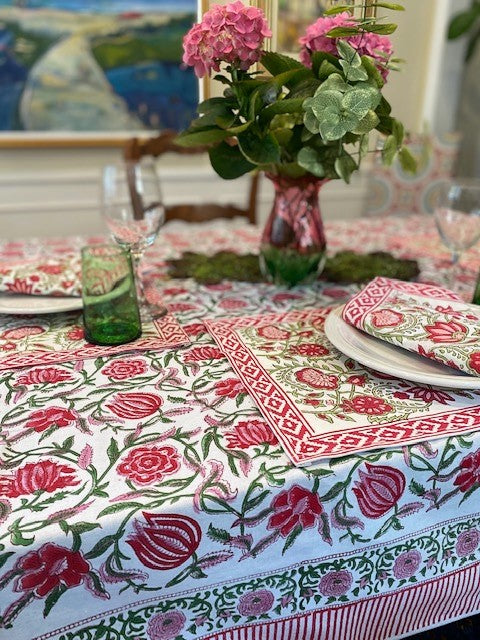 Elegant Floral Block Print Table Cloth is Festive. (60x90) Napkins and Placemats Available