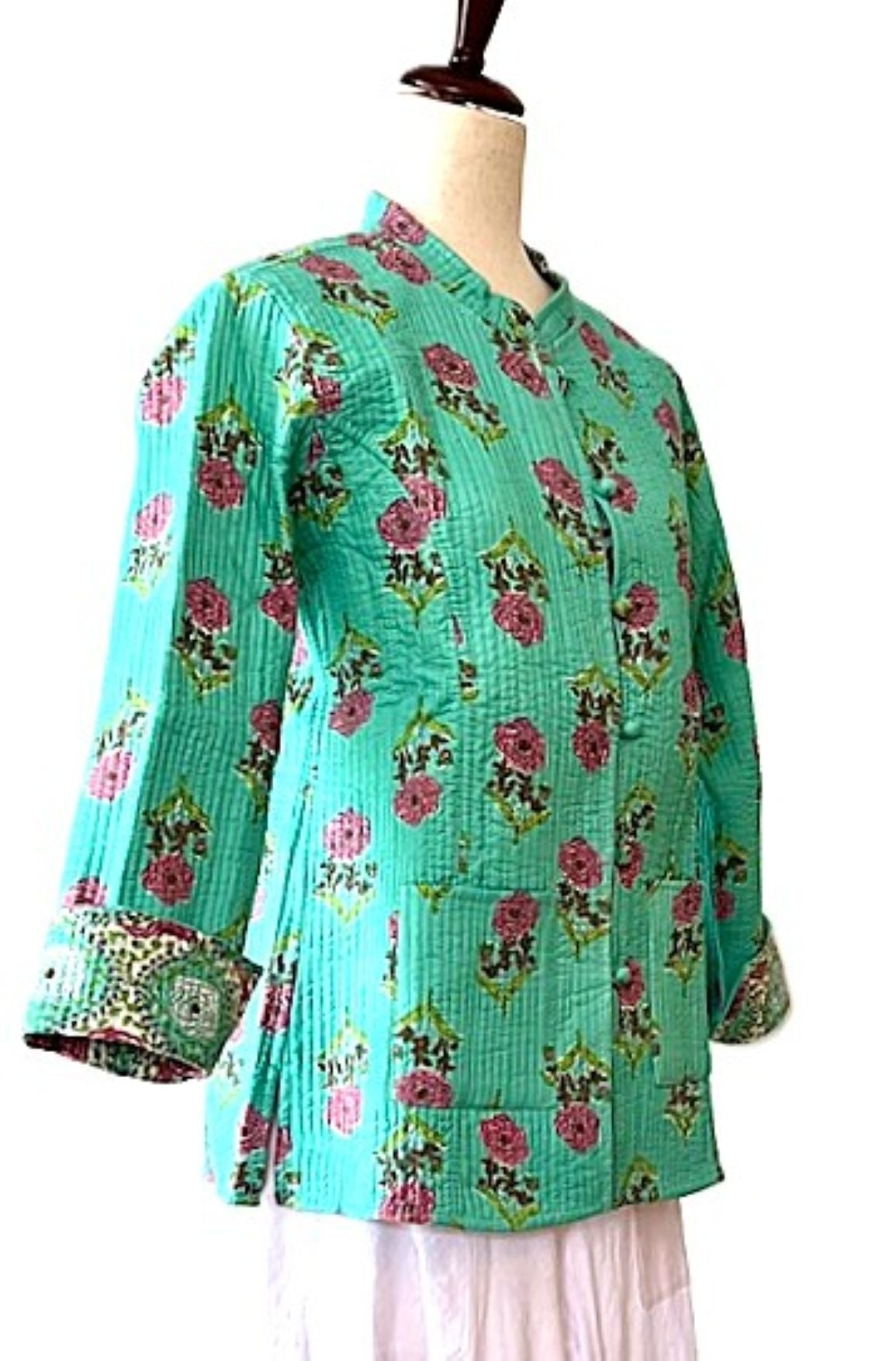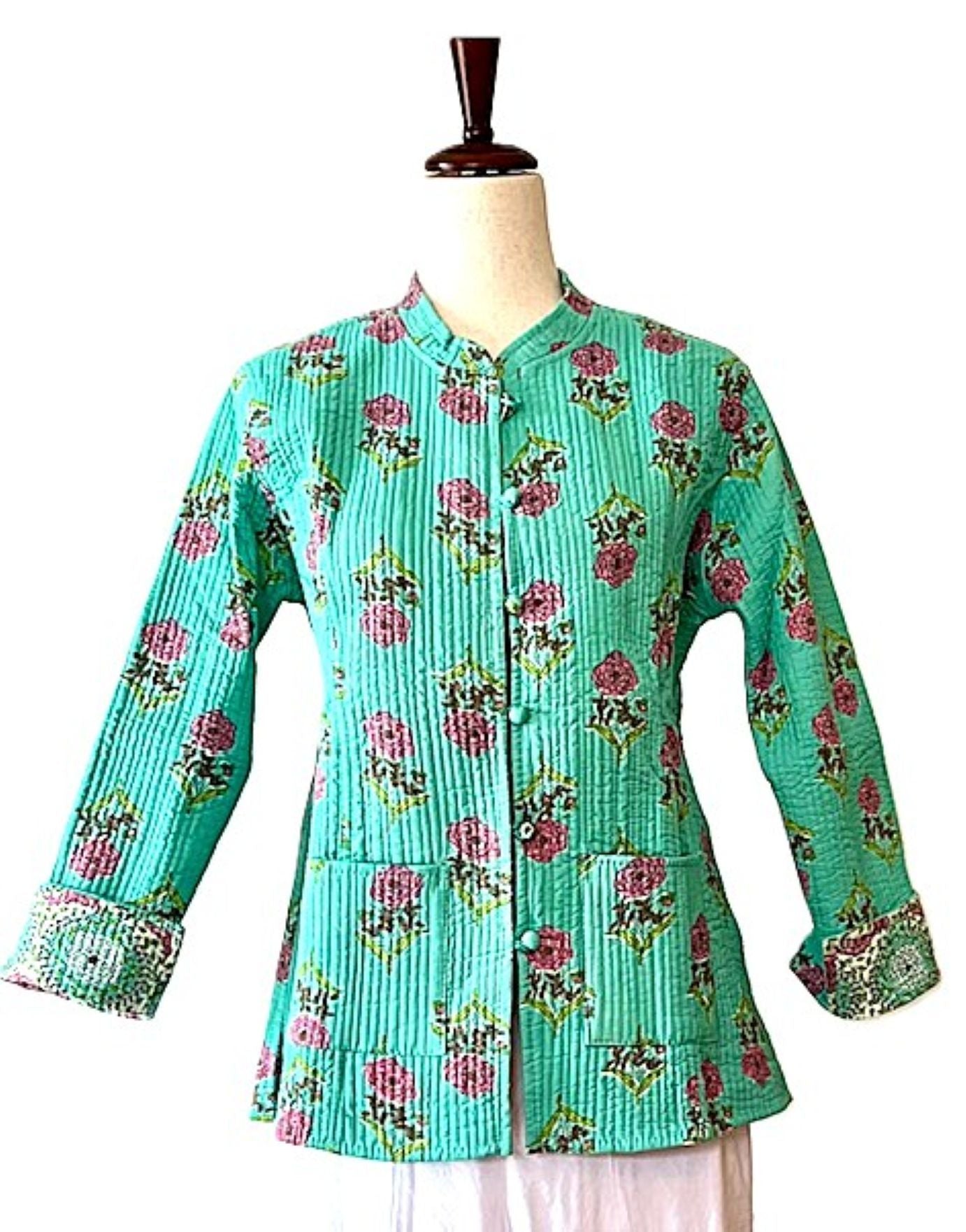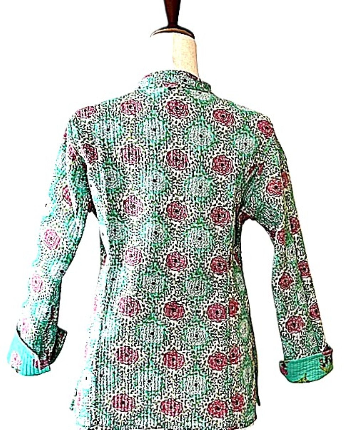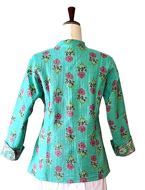 Cotton Quilted Womens Jacket with a mandarin tab collar is striking. This reversible cotton quilted jacket looks so rich in lush tones of green, aqua, rose, blue. Each side displays an engineered spacial pattern. The reverse side is a mini print in the same colors. Handmade, quilted on new cotton, with covered buttons down front. Split cuff may be folded back to expose the reverse side and also adds interest. Beautiful. Styled in a short blazer jacket resting at the hips. Long sleeves with split seam, fold back to expose the mixed print adjusting the sleeve length. Nice designer detailing. 100% soft, new cotton. Traditional sizing. Year round use, day into evening conversion is a breeze.
