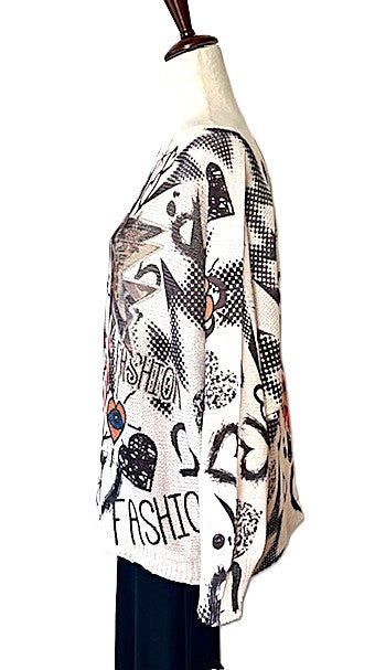 This Italian Knit Sweater is beautifully crafted and one that will add a pop of style to your outfit. A blend of hues in various shades of copper, beige, black against background of beige. Abstract pattern with a Italian graffiti flavor. Round neck, easy fit, 3/4 sleeves and cut loose and flattering for all figures. One size fits most..