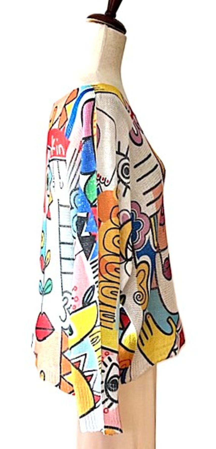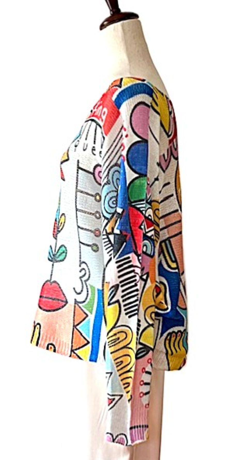 This Italian Knit Picasso Face Sweater is beautifully crafted and one that will seamlessly add style to your outfit. Fun and youthful. Round neck, easy fit, long sleeves and cut loose and flattering for all figures. One size fits most.