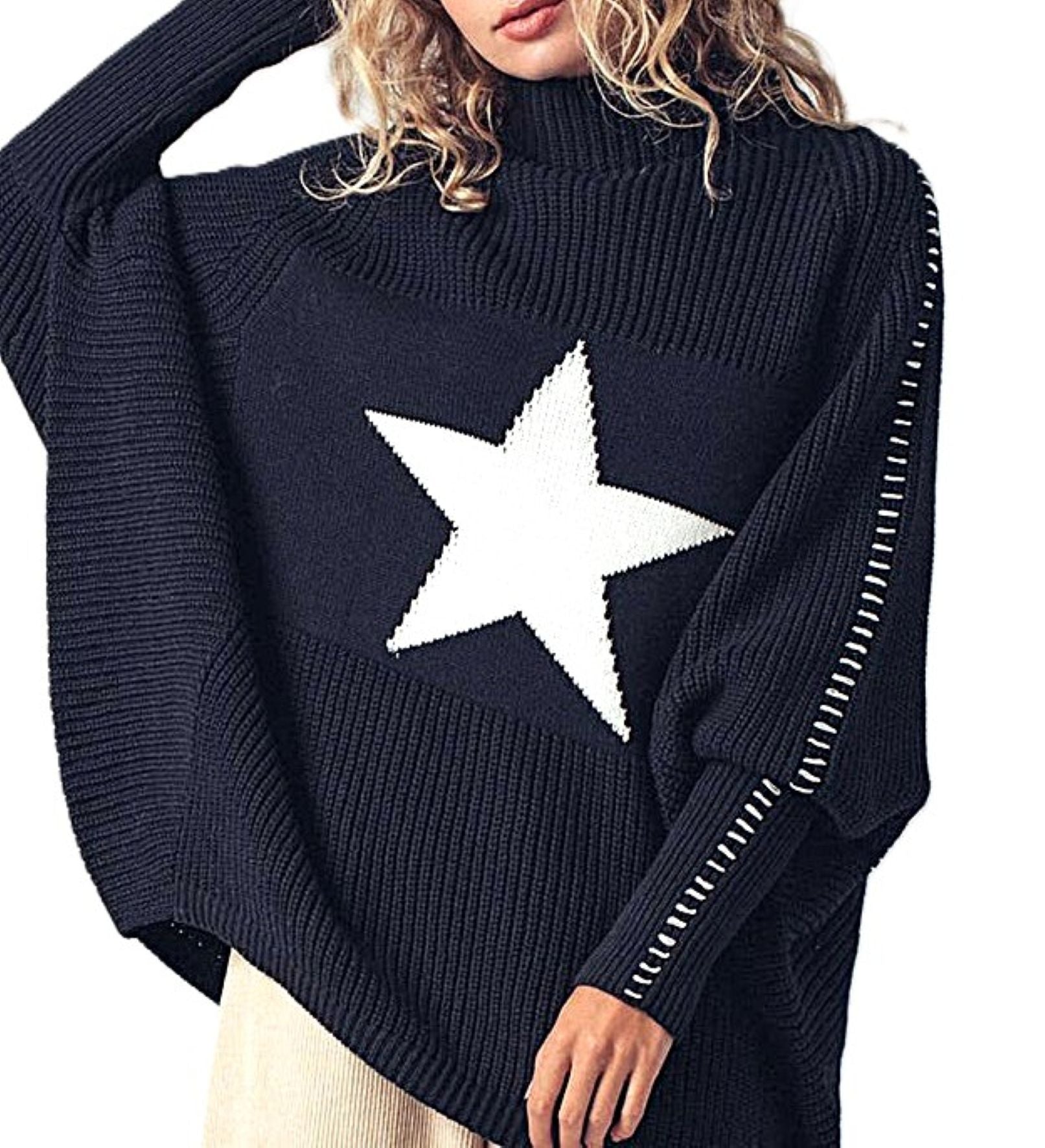 Top, Oversized Star Sweater Tunic with Side Stitch (Black)