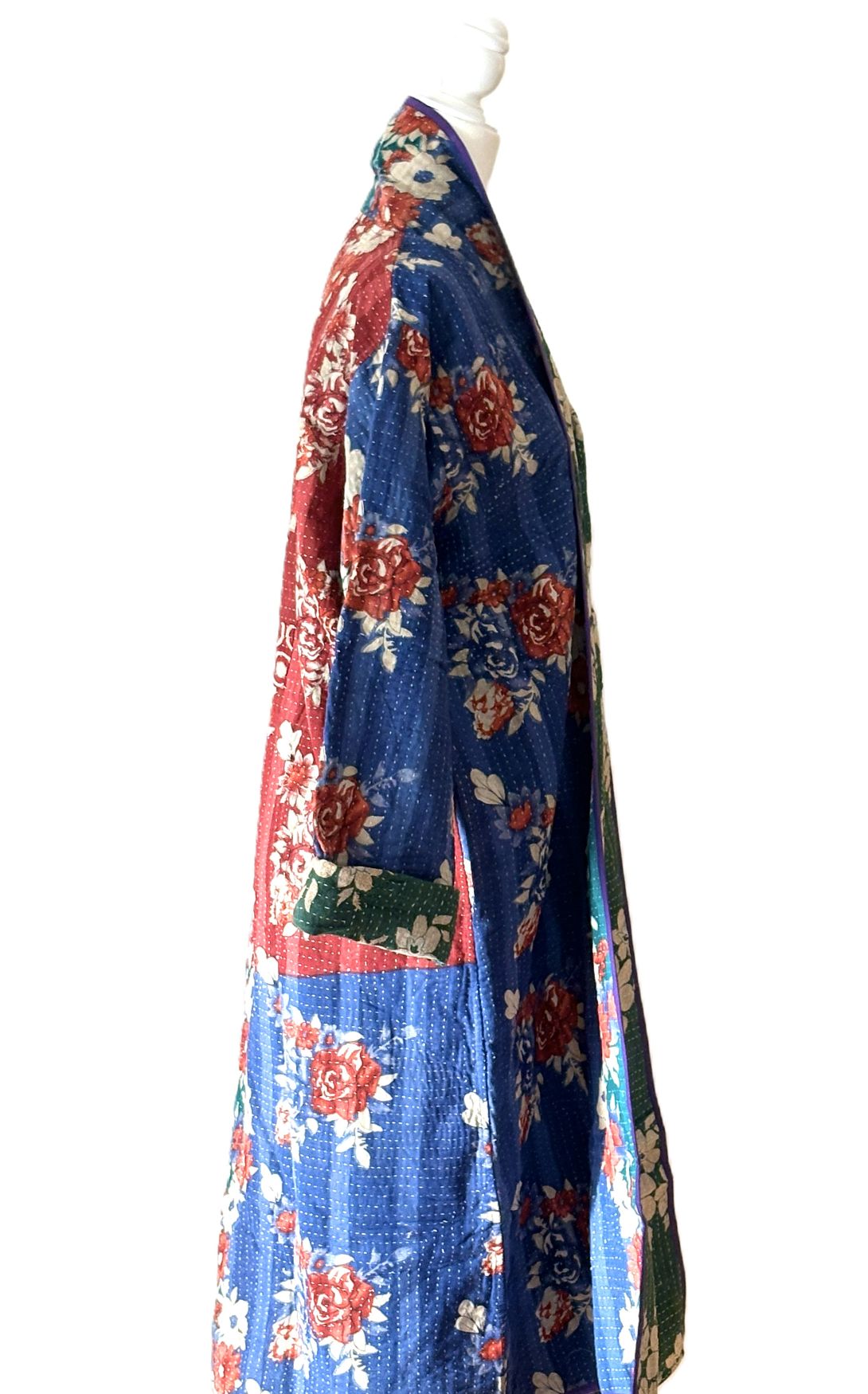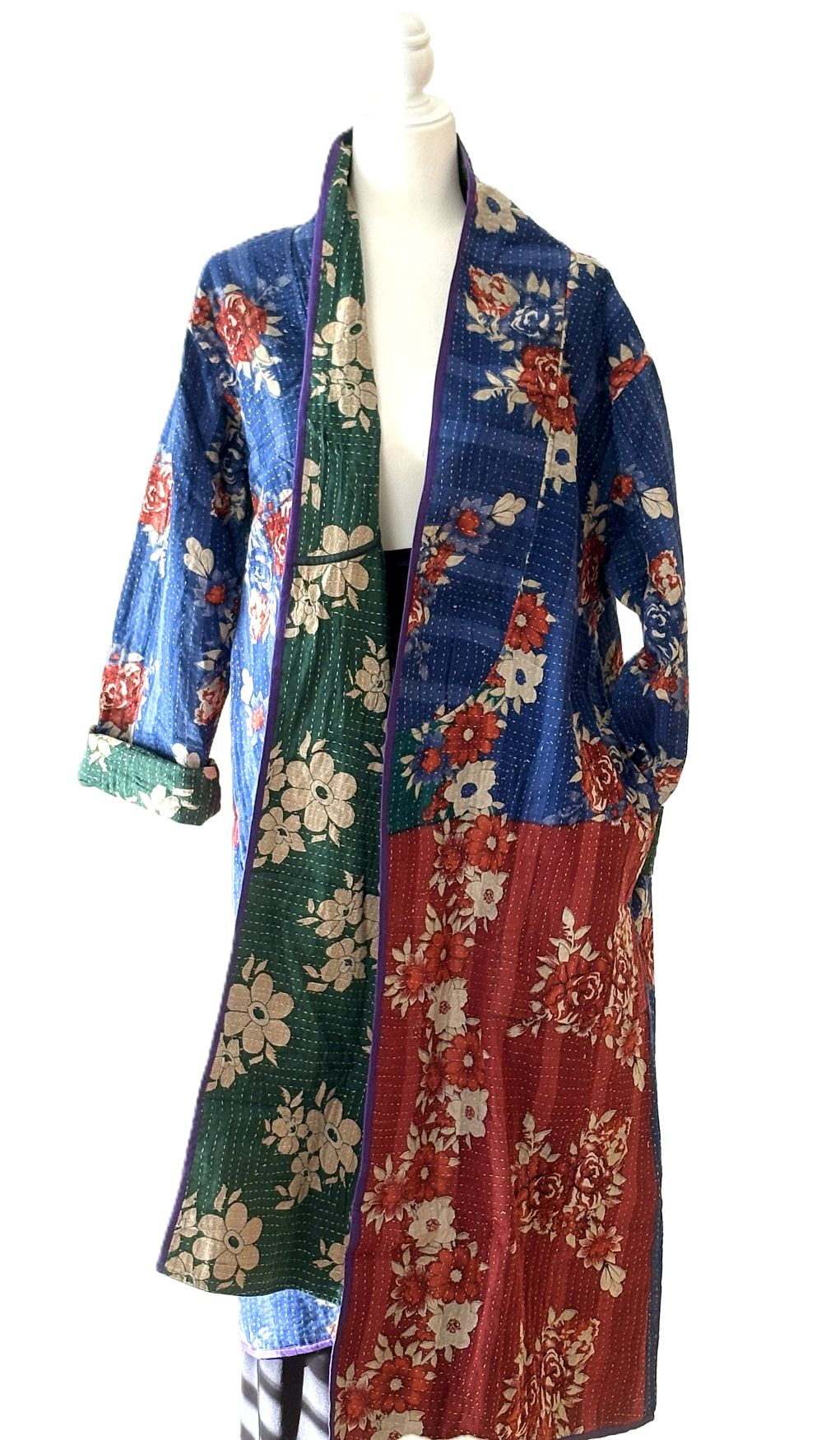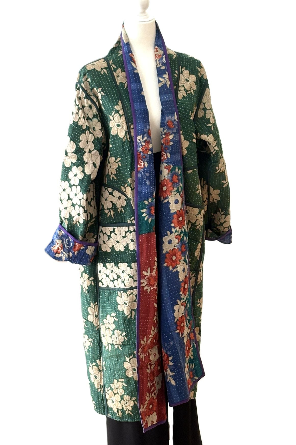 Jacket - Wearable Art, Fully Reversible Hand Embroidered Kimono Coat. Boho fashion using the traditional hand Block printed method. A nice balance of Bohemian influence while preserving the traditional, classic look. So many details make this coat special. The print is unusual and fresh using colors from the current RTW market. Colors will compliment your existing wardrobe. We love the companion print for the reverse side. Similar but different. The engineered border print is stunning and remarkable running down the back panel. Best example is the back vertical panel. 4 pockets, two on each side cleverly positioned.