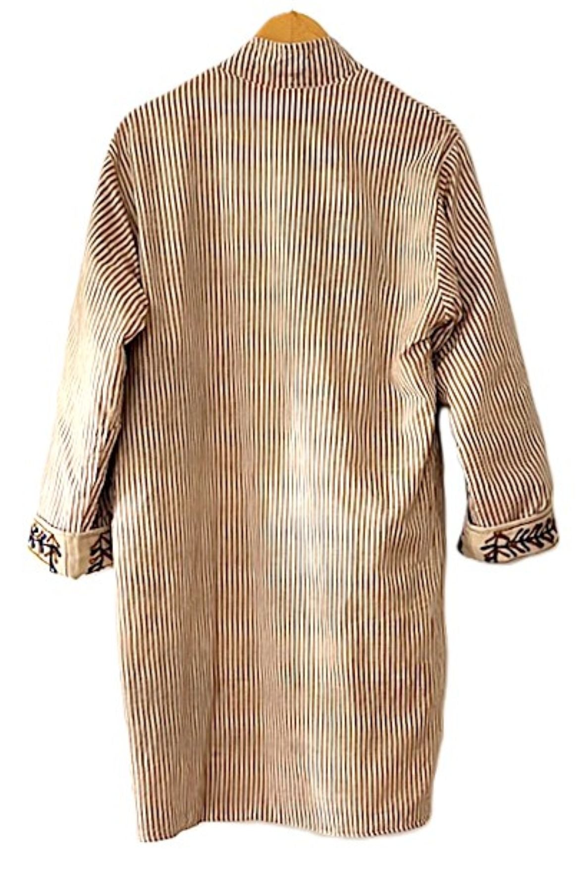 Jacket, Wearable Art In This Stroller Length Embroidered Canvas Boho Kimono. Handmade, embroidered in a large floral pattern in turquoise, beige, and cream. Fully reversible, tailored classic stripe in subtle tones of parchment and bronze. Long Jacket is a captivating blend of boho charm and artisanal craftsmanship. A classic cut, fully lined, light weight, and seasonless for year round use. Mandarin tab collar and front placket are delicately embroidered in a small vine, very tasteful. Beautiful back panel displays the artistry of the complex suzani pattern. Designed to be worn open, comfortable and roomy for an easy fit.