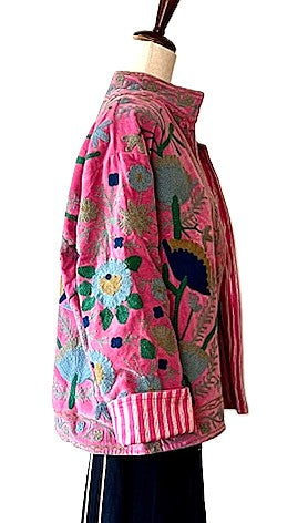 From our Specialty Collection, Wearable Art In This Hand Embroidered Short Cotton Velvet Jacket. Delicious color, pink with primary colors in the suzani motifs. Crafted with utmost attention to detail, fully lined in soft cotton pink and white stripe. This piece is embroidered by hand with wool thread and stitched in small batches. Designed as a short box cut jacket, round tab neck with contrasting trim that is carried through to the hem and cuffs. Open box cut is comfortable and easy to wear. This jacket is reversible and looks fresh in pink and white stripe. Nice designer detailing. Jacket is designed to be worn open. A true classic destined to be worn for years.