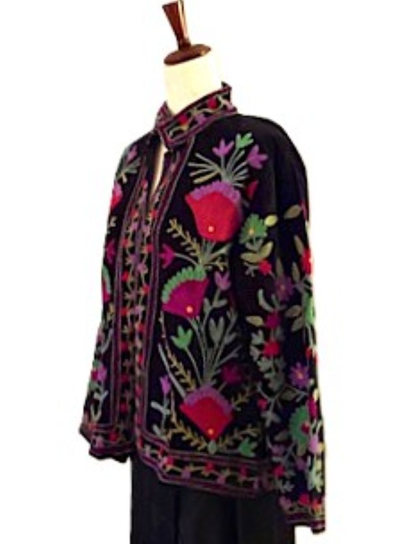 From our Specialty Collection, Wearable Art In This Hand Embroidered Short Cotton Velvet Jacket. Complex design with multicolor with primary colors in the suzani motifs. Crafted with utmost attention to detail, fully lined in soft cotton black and white stripe. This piece is embroidered by hand with wool thread and stitched in small batches. Designed as a short box cut jacket, round tab neck with contrasting trim that is carried through to the hem and cuffs. Open box cut is comfortable and easy to wear. Nice designer detailing. Jacket is designed to be worn open. A true classic destined to be worn for years.