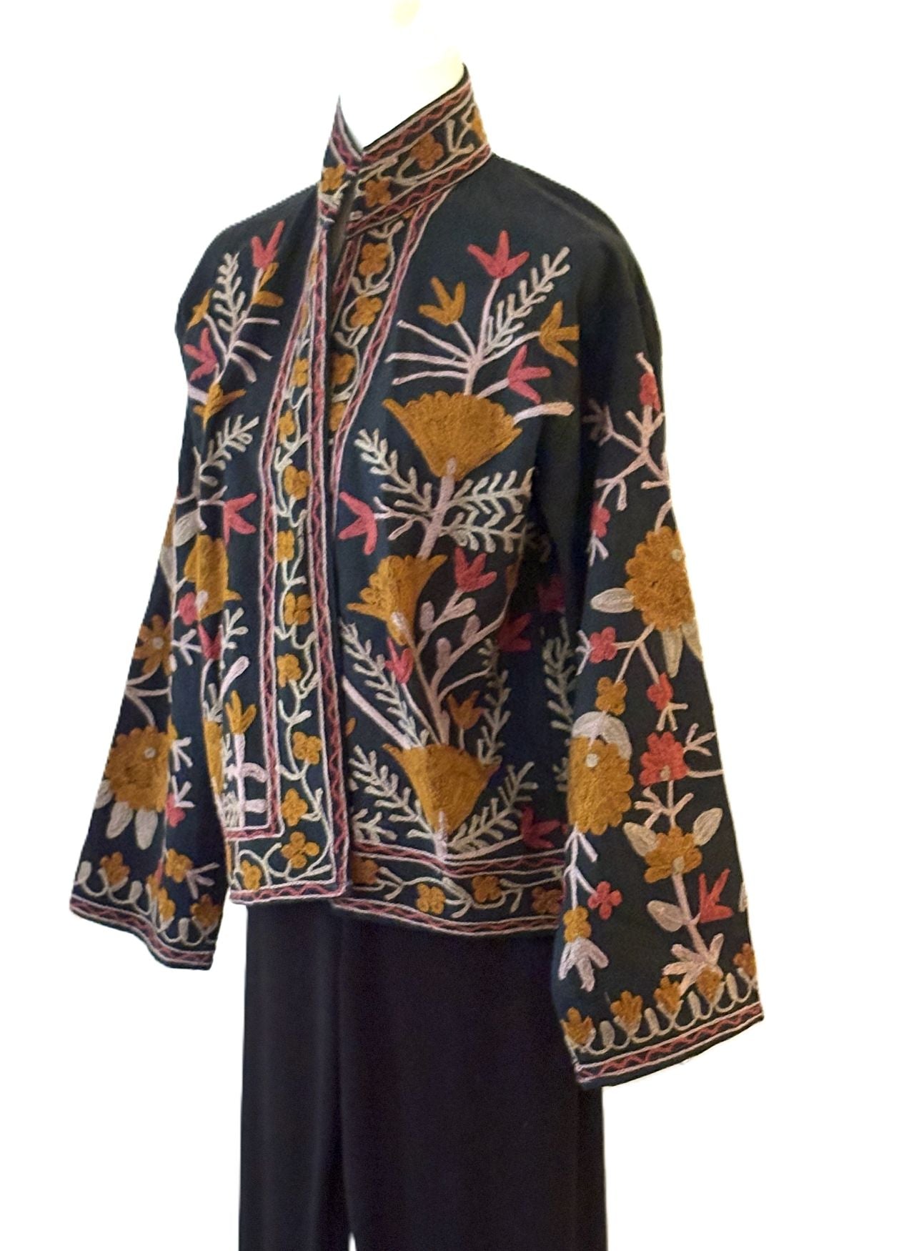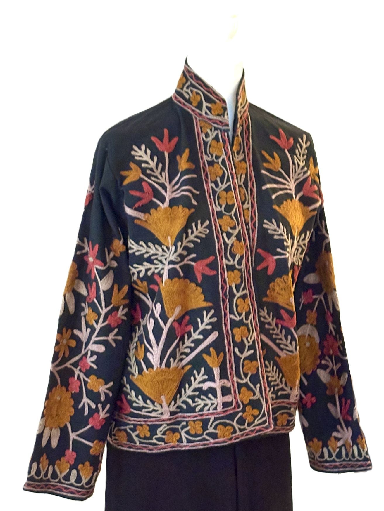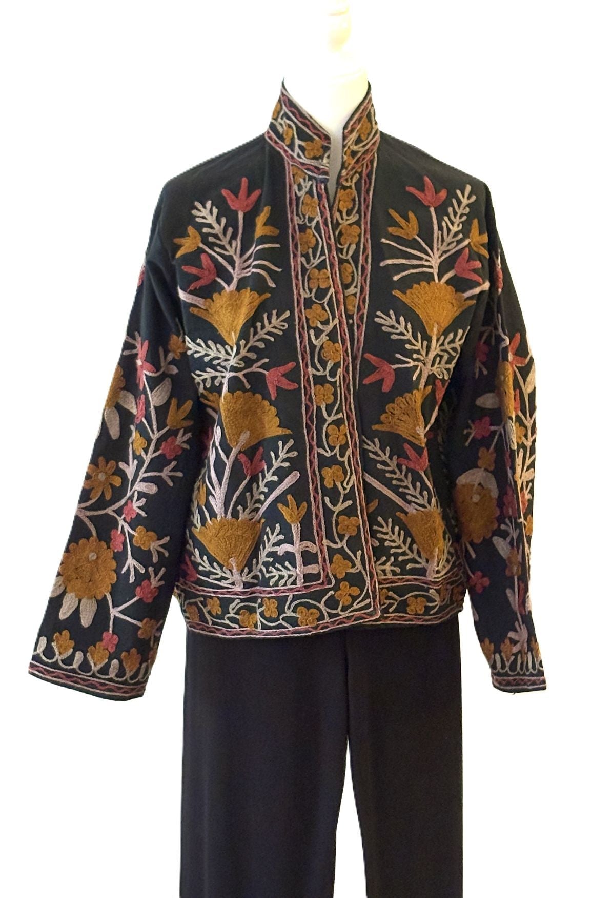 Jacket, Wearable Art In This Hand Embroidered Short Top With Suzani Embroidery (Black)