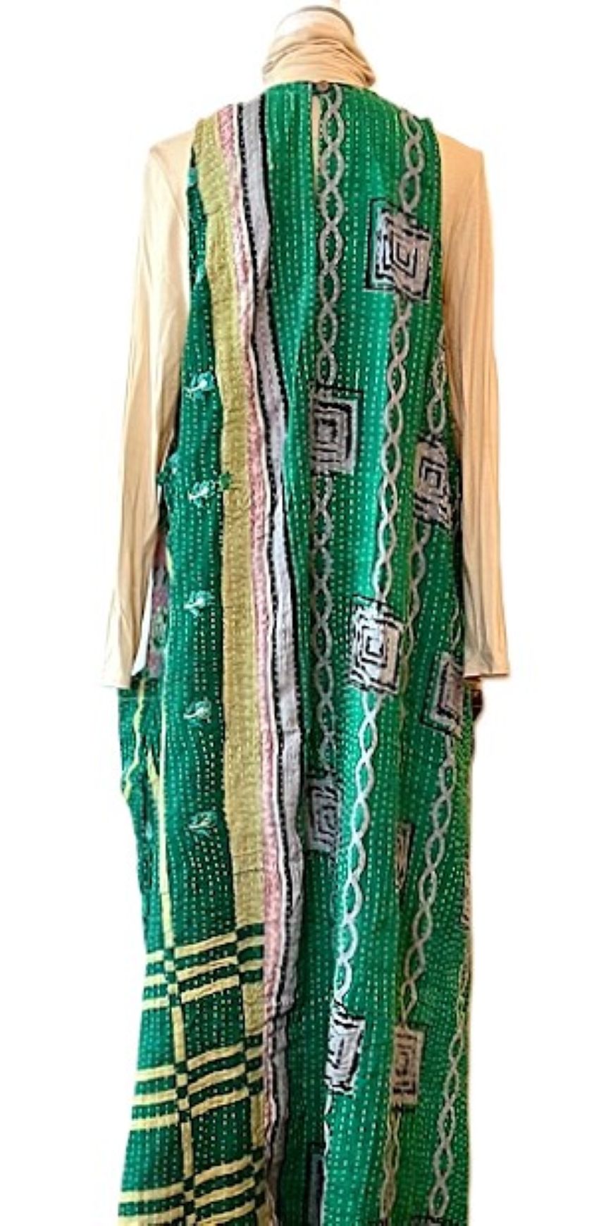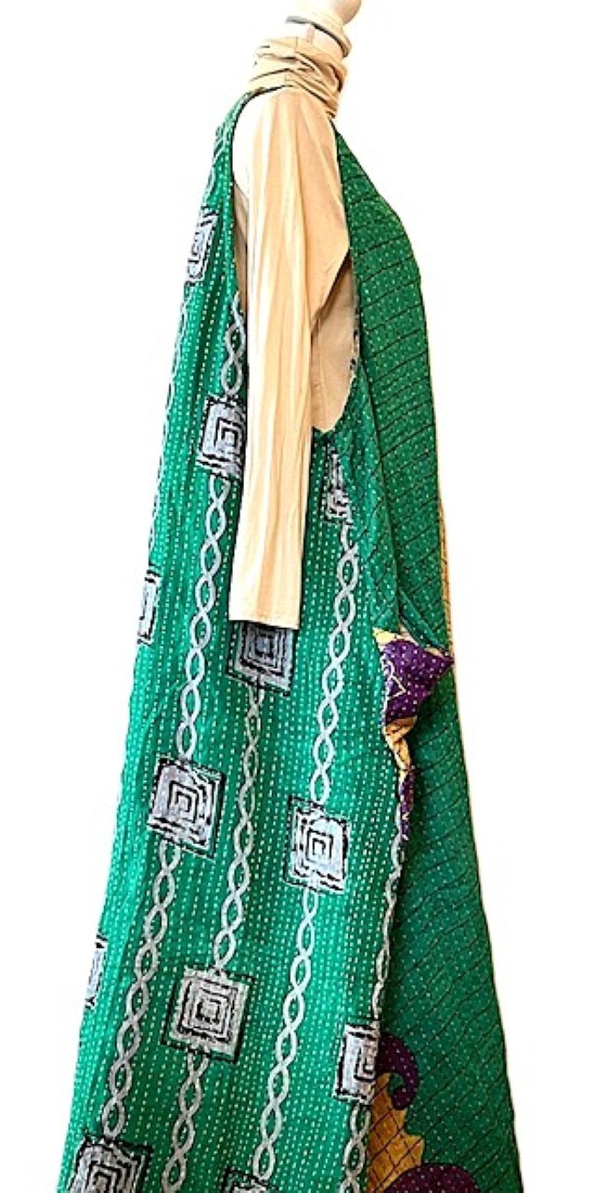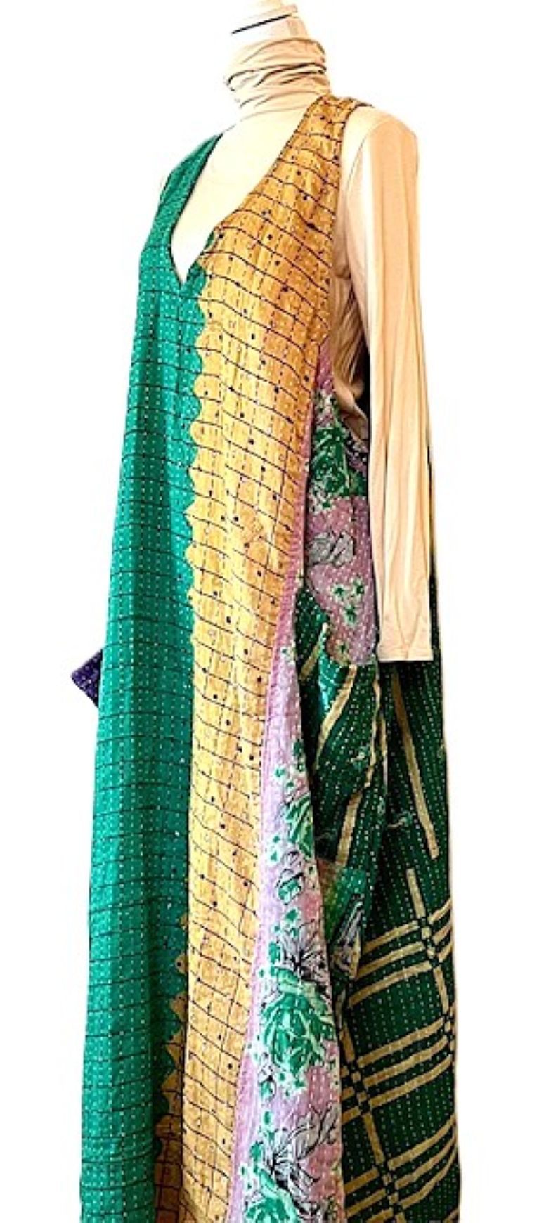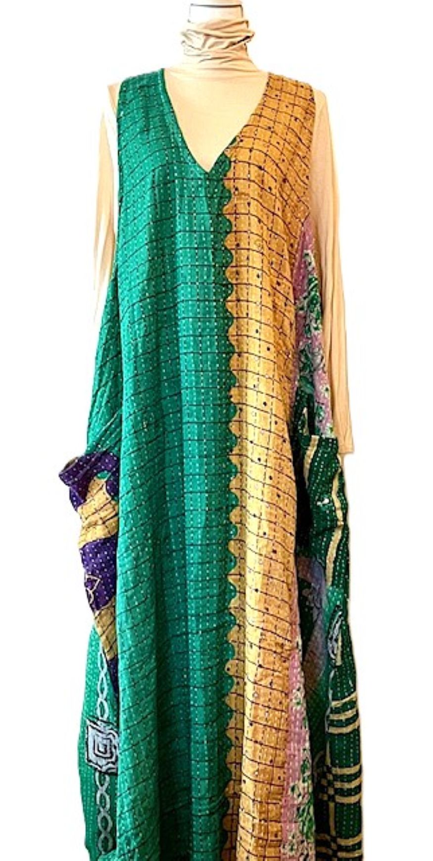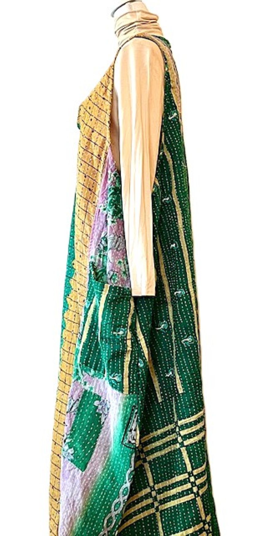 Maxi Sleeveless Cotton Jumper or dress is Boho Chic. Crafted from cotton vintage kantha sari. Designed as a loose and floaty silhouette, slouchy front pockets. Deep V sides provide maximum comfort. Coordinating long sleeves T-shirt, turtleneck, or blouse is pure comfort for lounging. Looks great as a sleeveless dress, casual jumper, beach coverup. May be worn year round determined weather and your choice of tops. Great for music festivals, concerts, and outdoor events.