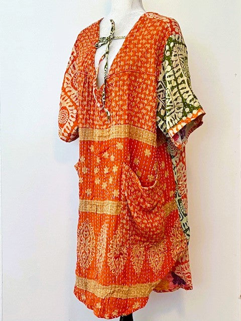 Kantha Bae Oversized Embroidered Tunic is made from 100% cotton luxe sari. Pleasing mixed print blends a foulard, geometric, and ethnic pattern in a warm clay, with green and bronze. Very smart. Features a V-neck with two exterior slouchy pockets in front. Decorative front neck tie is optional to tie. Tratitional kantha embroidery throughout. The depth of color, blend of patterns, rich luxe fabric will quickly become one of your favorite pieces. This is a new and unique style. Each print tunic is one of a kind and a true designer piece. One size fits most.