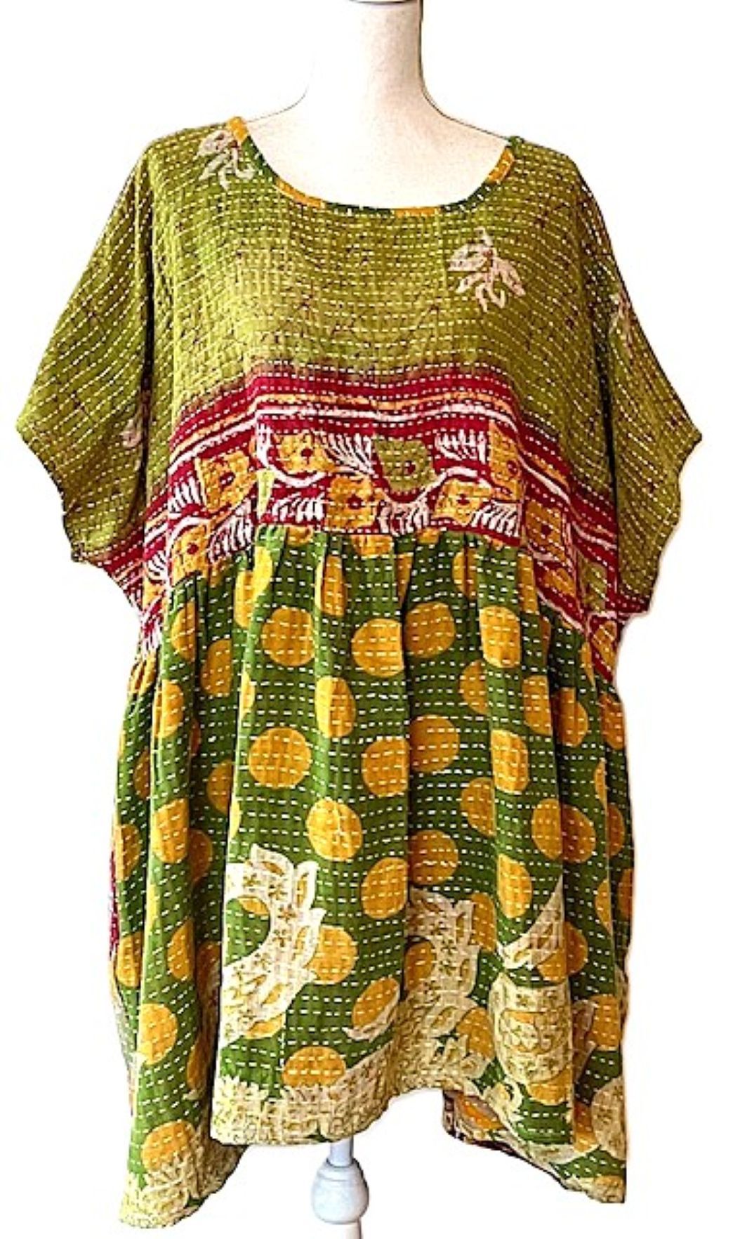 Artisan Kantha Bae Quilt Mini Dress. Dress falls just above the knee. With a high low hem, the dress is perfect for all ages. Soft, and Very Chic. An absolute favorite in daytime dresses. and a best seller.  This dress is a perfect example of maximizing the use of mixed prints to achieve a sophisticated fashion statement.