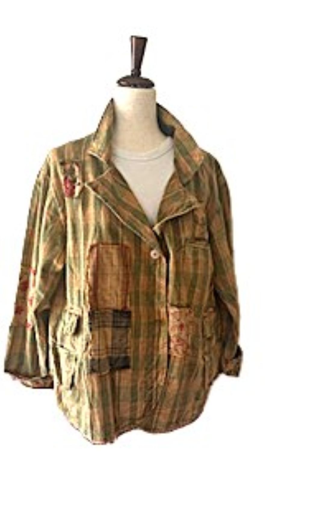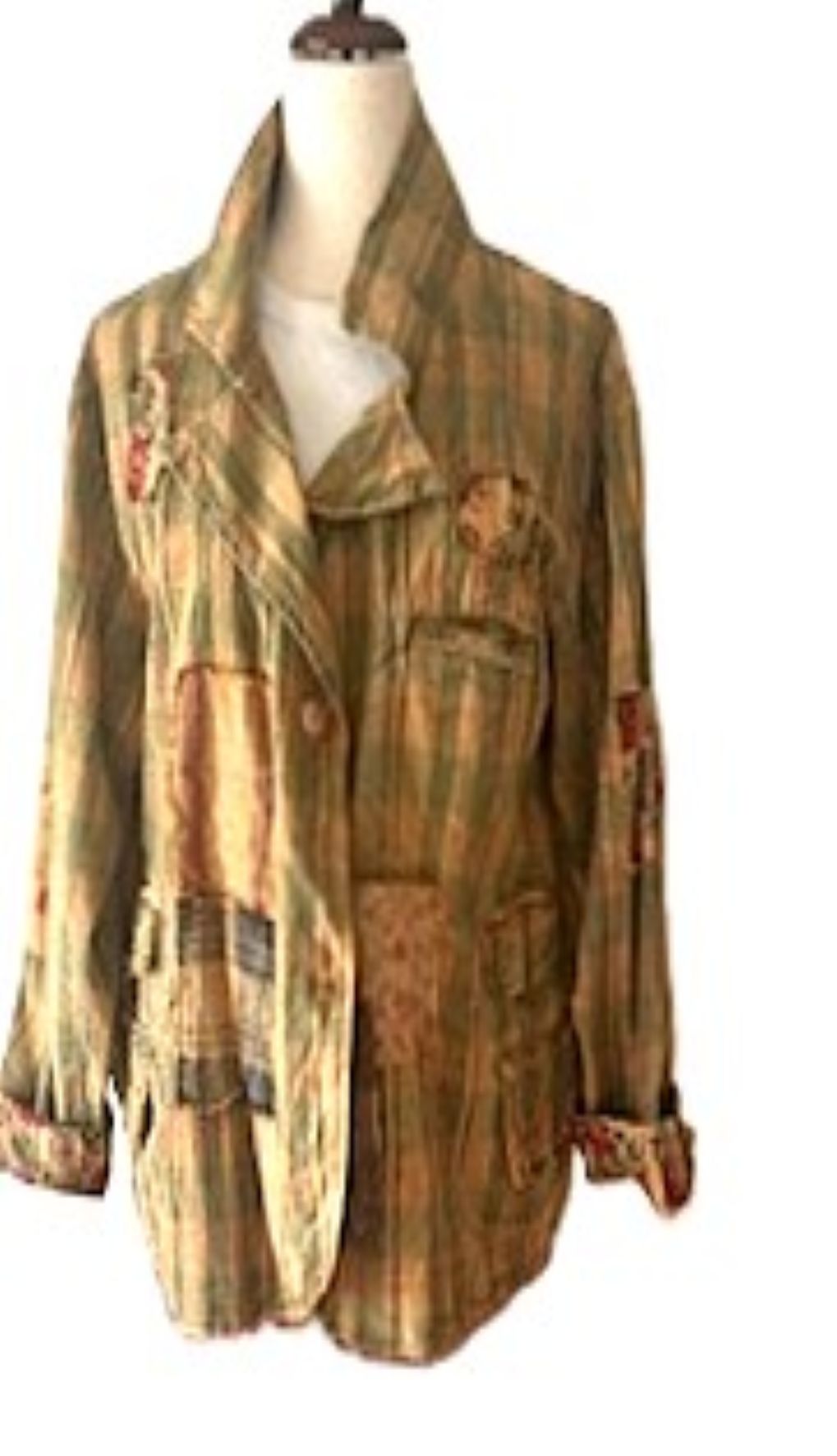 Long Sleeve Designer Rose Garden Views Jacket, The New Basic. Long sleeve colored denim over shirt, distressed and adorned with patchwork squares. This designer denim jacket elevates the concept "casual denim", updating your wardrobe to new "BoHo" heights. Mustard and khaki colors are an important color for the season. Looks exceptional paired with khaki, navy, denim, red, and tan. Red rose print beautifully compliments the base khaki color. Useable pockets on either side of the jacket. Loose, designed to be worn as a jacket yet much more comfortable. Made in the USA.