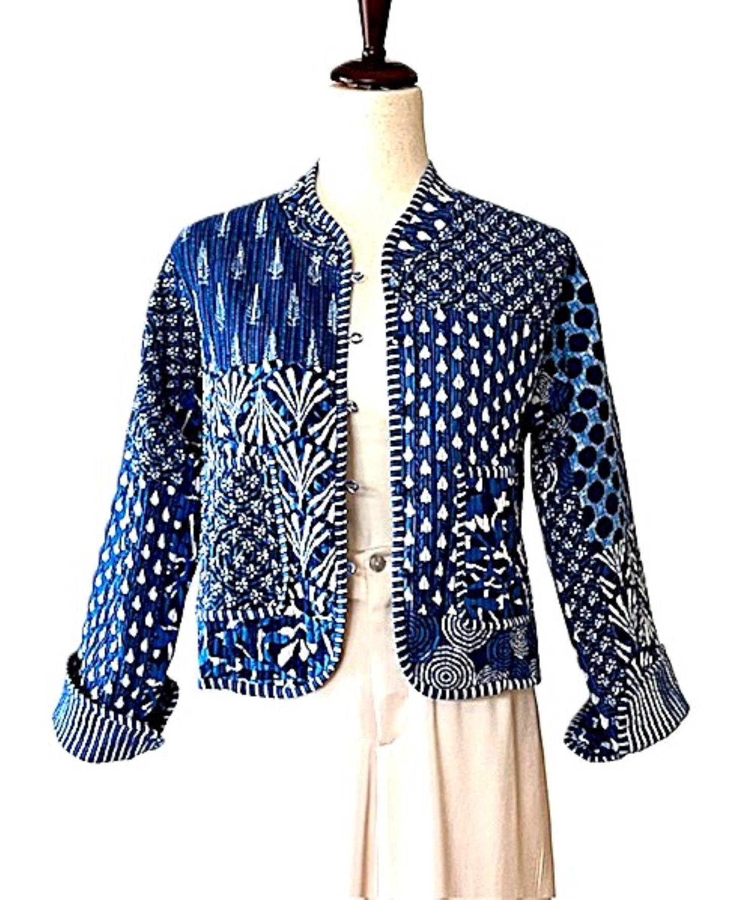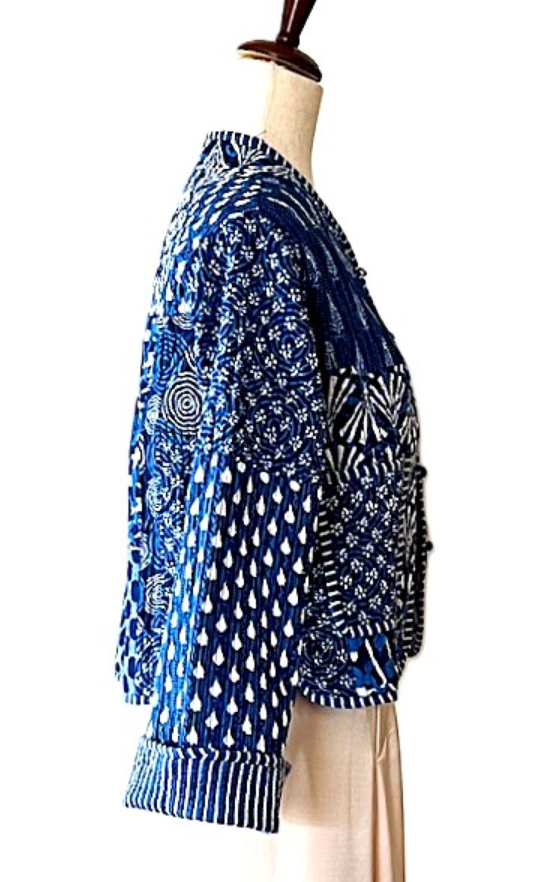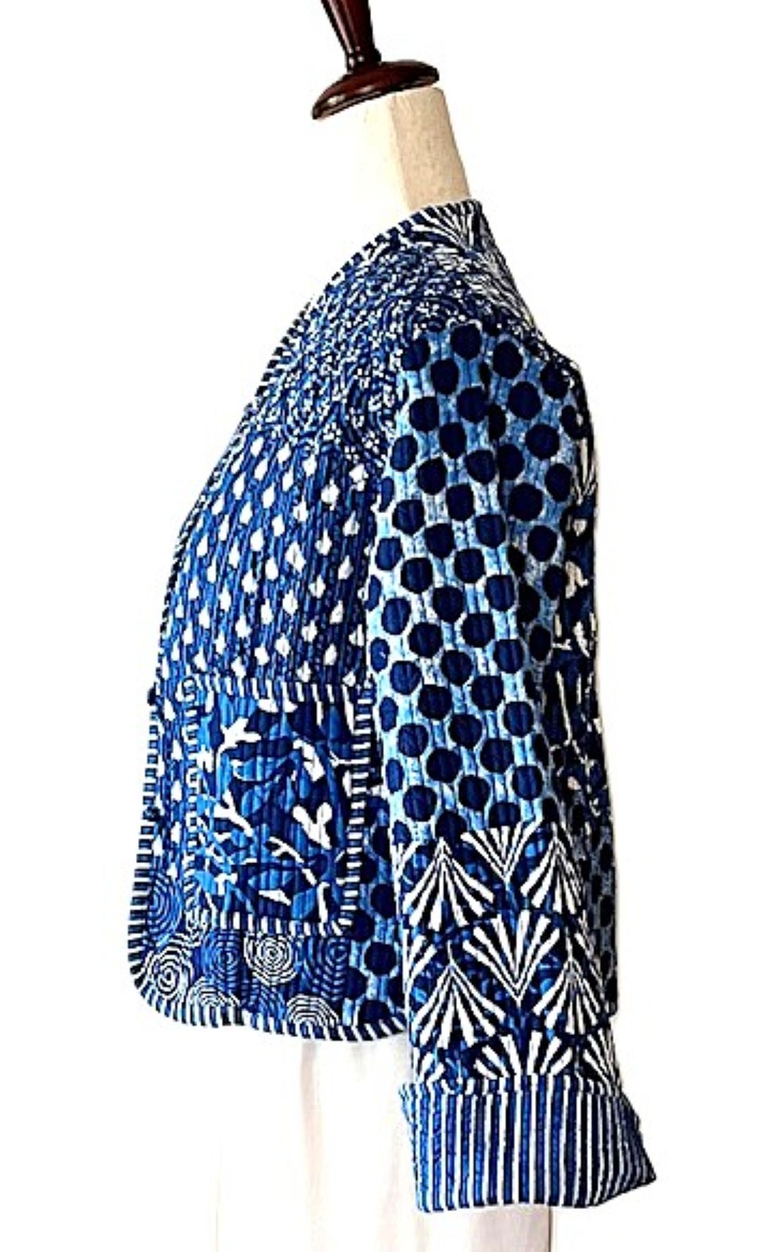 Reversible Cotton Quilted Womens Jacket With Stripe Piping is adorable. Handmade, quilted, patchwork pattern, button down front. Styled in a short blazer jacket resting just below the waist. Long sleeves with split seam, fold back to expose the cute piping, adjusting the sleeve length. Nice designer detailing. Each jacket is unique and one-of- a- kind.