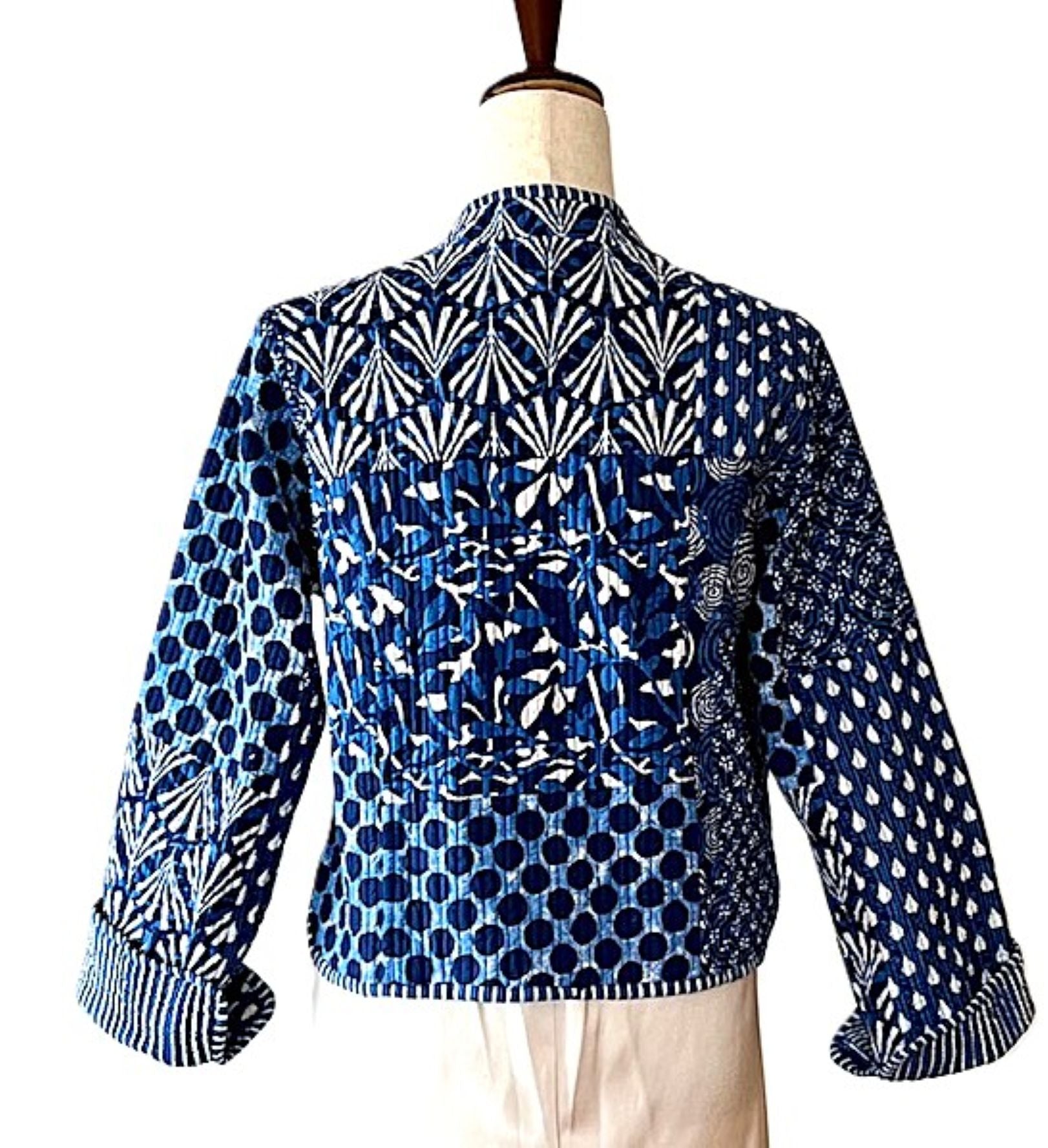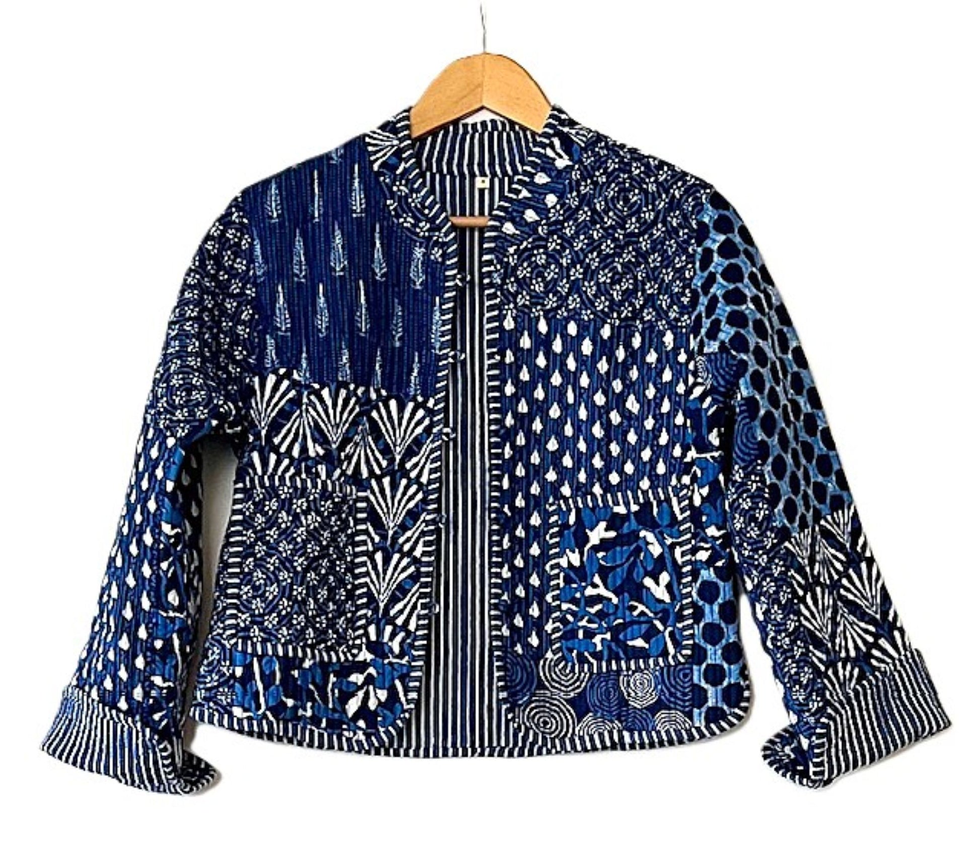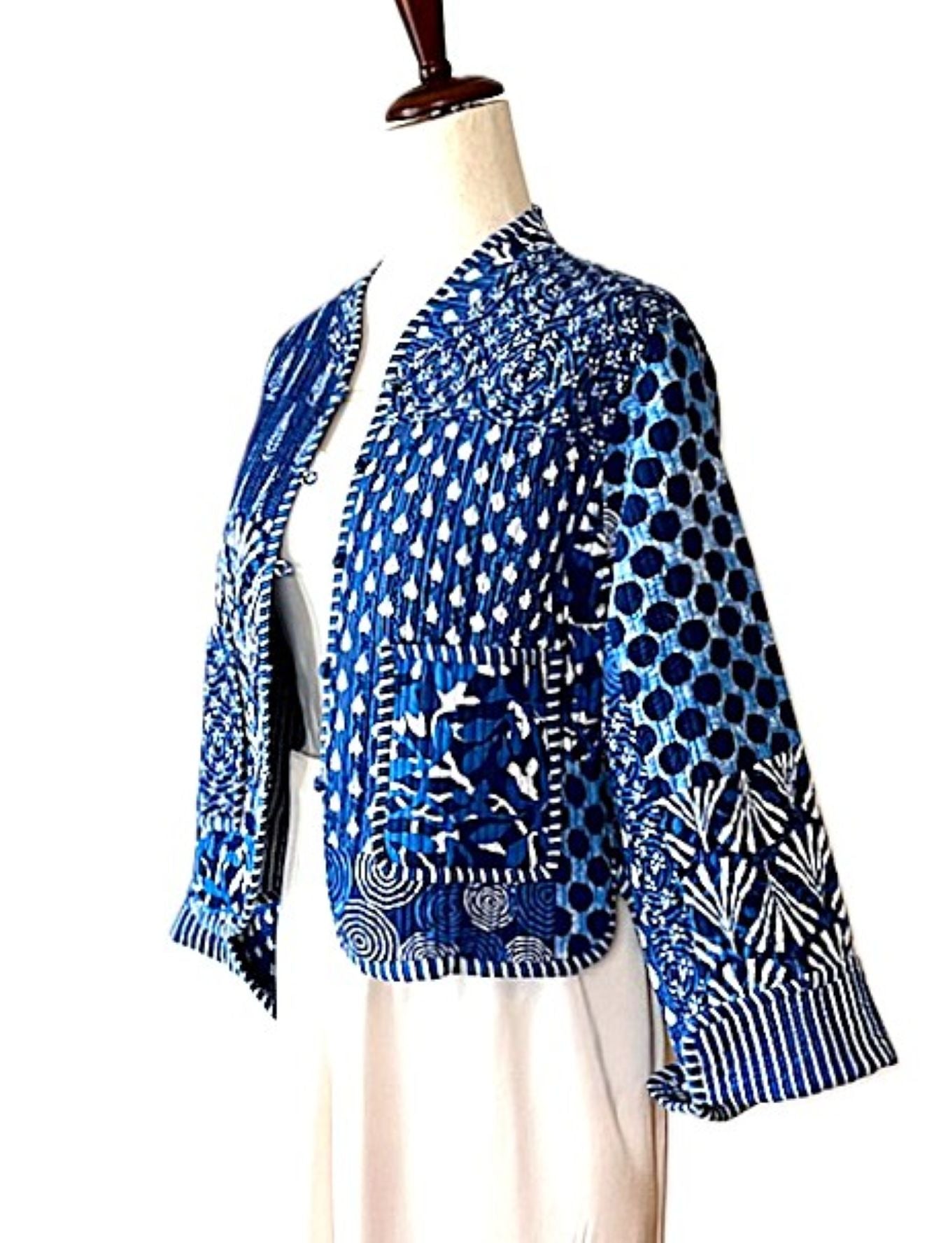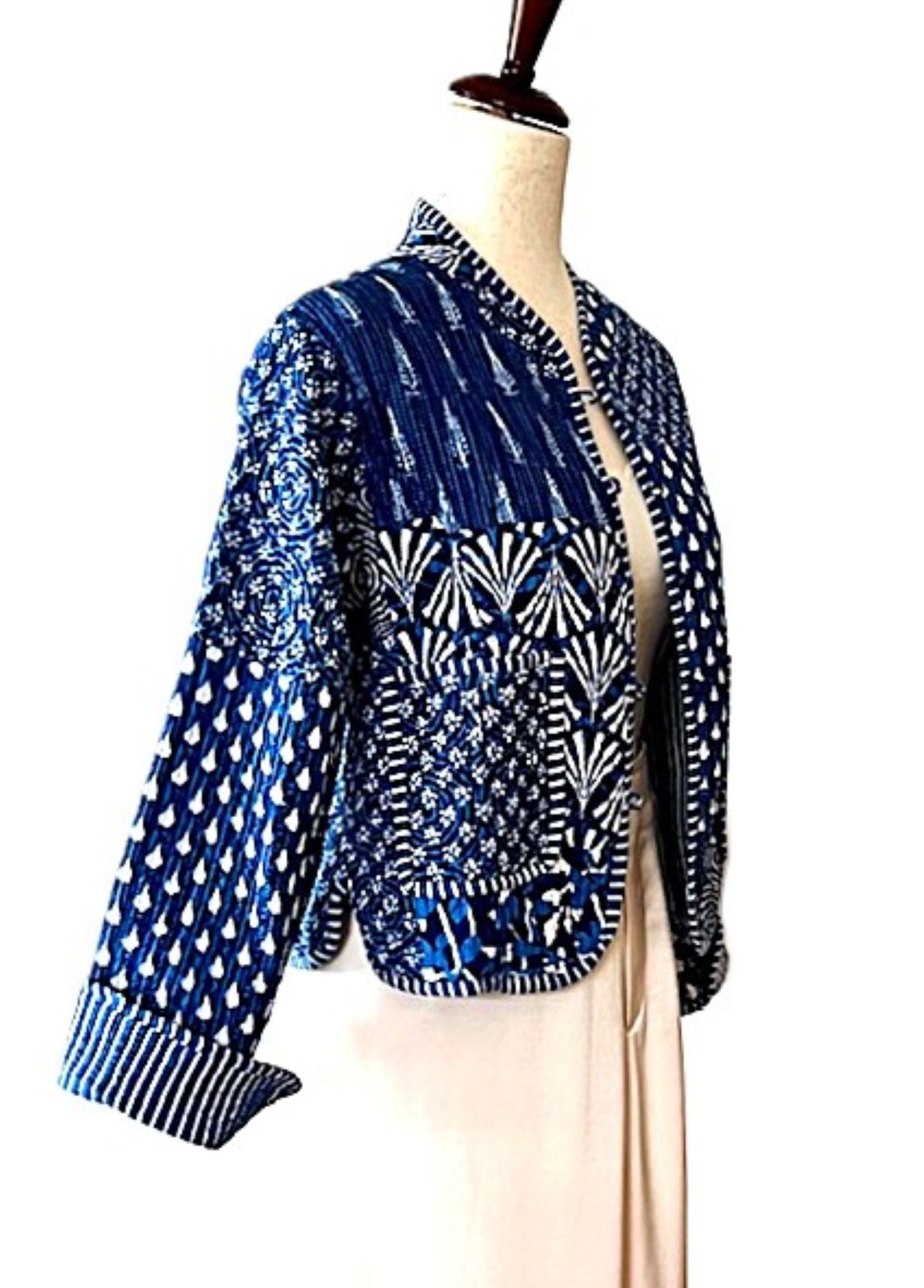 Reversible Cotton Quilted Womens Jacket With Stripe Piping is adorable. Handmade, quilted, patchwork pattern, button down front. Styled in a short blazer jacket resting just below the waist. Long sleeves with split seam, fold back to expose the cute piping, adjusting the sleeve length. Nice designer detailing. Each jacket is unique and one-of- a- kind.