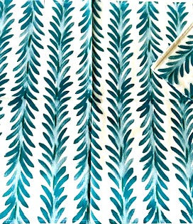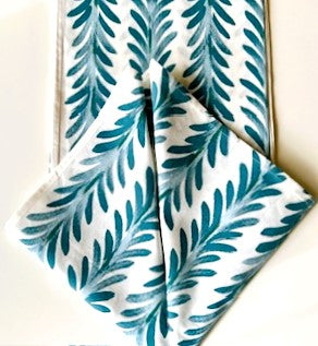 Bright tuquoise and aqua fern print on white. Works well with so many table cloth prints. This is a new vendor for us. They are usually sold out but we were fortunate to have our "wish list" granted.