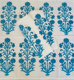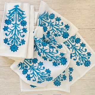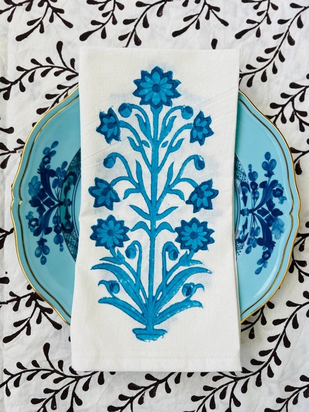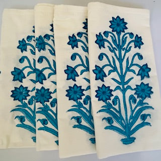 Luxe Dinner Napkins, Bloom Block Printed In Aqua. Striking