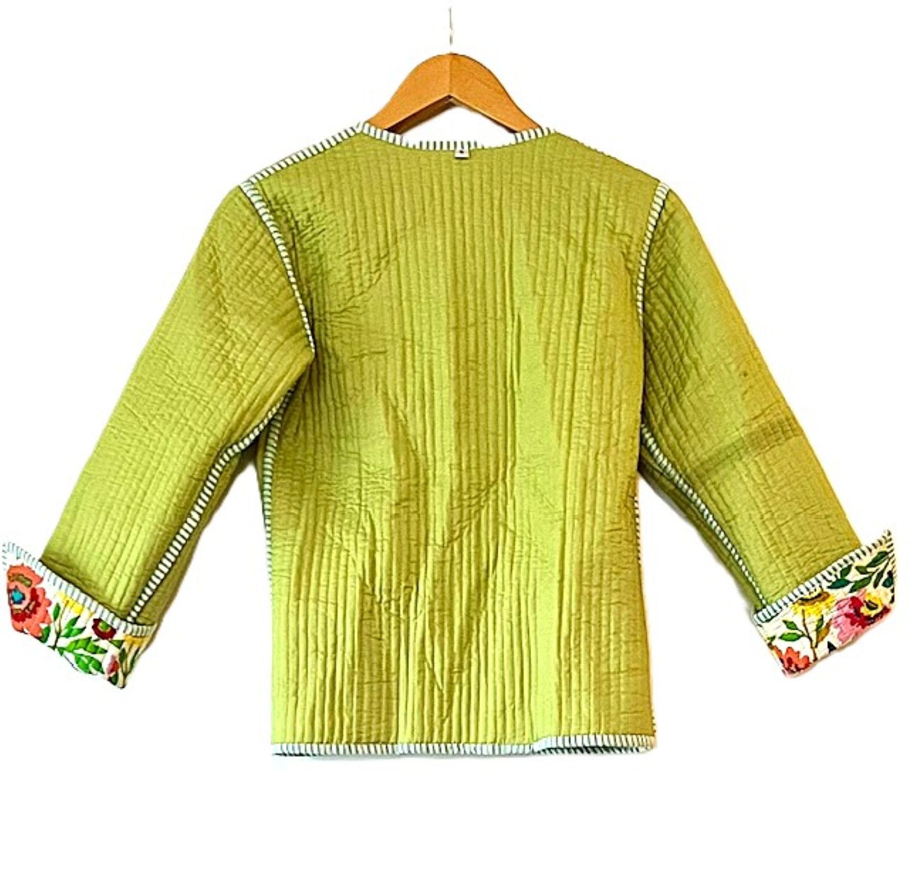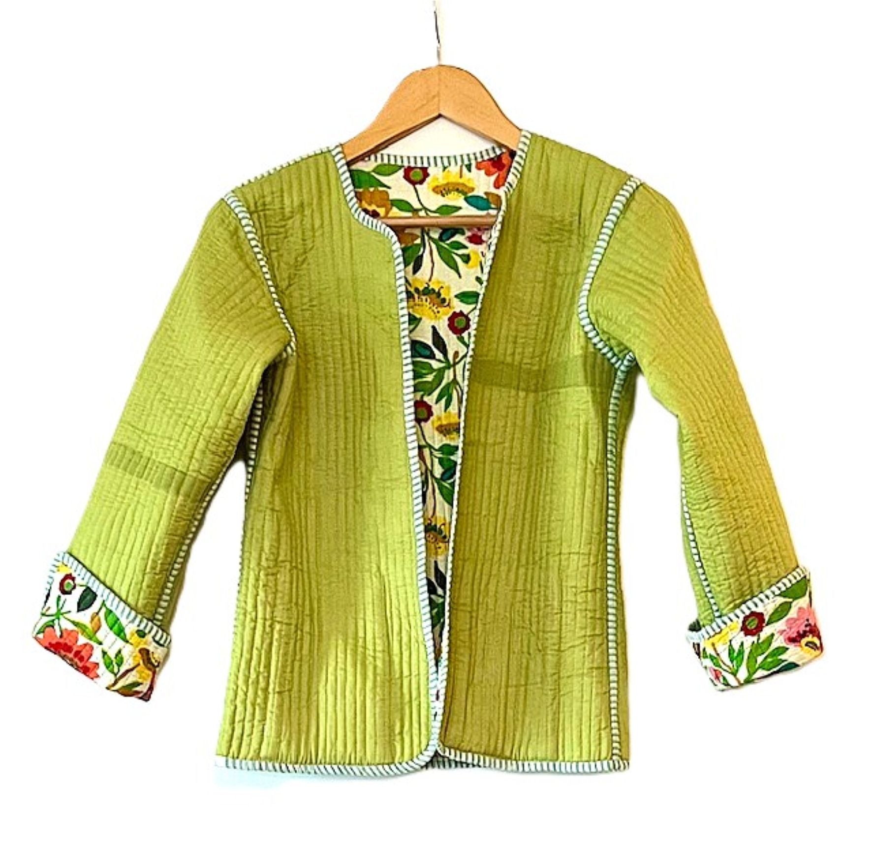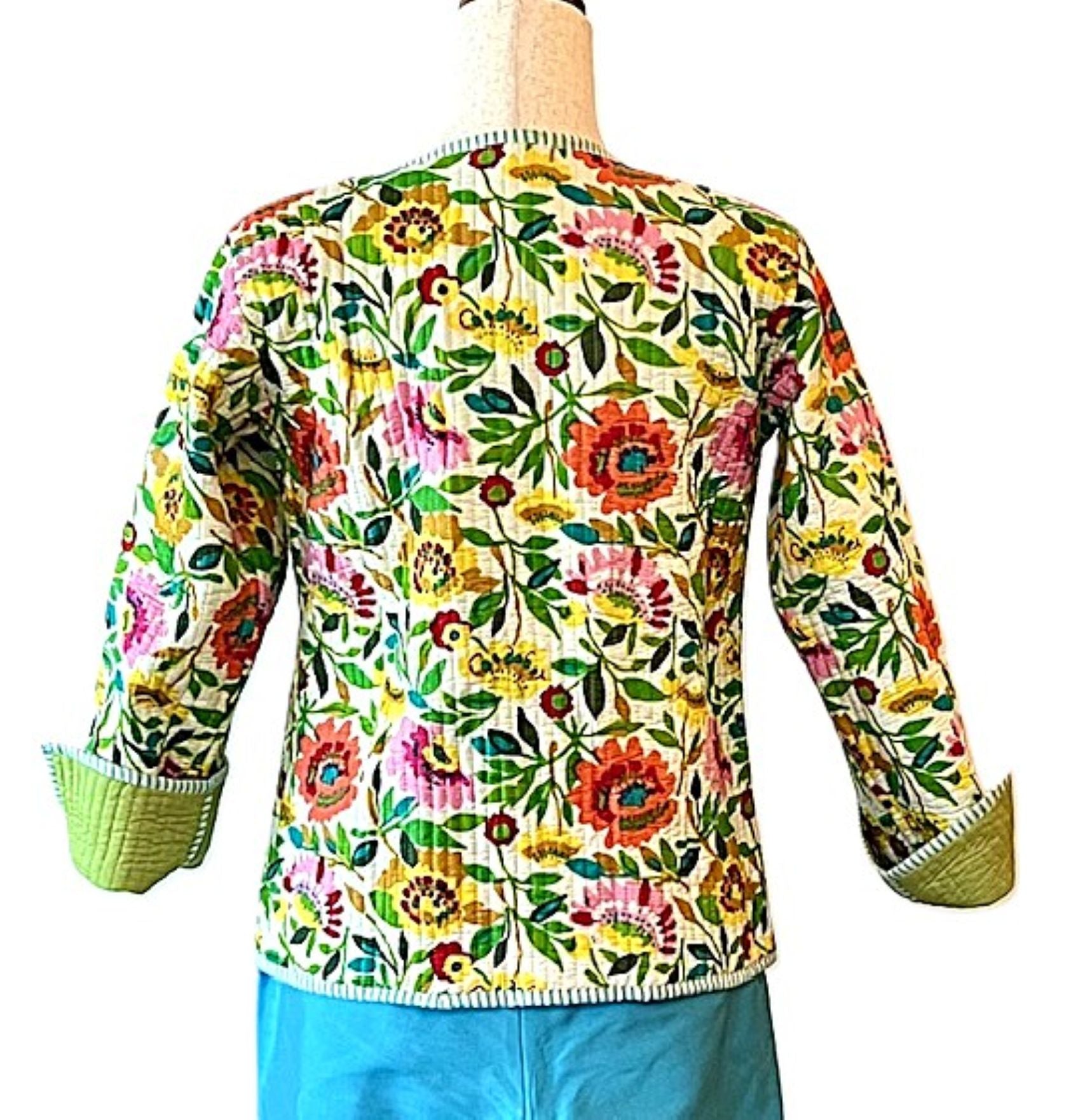Reversible Cotton Quilted Womens Jacket Comes Alive In This Beautiful Garden Print. Fully reversible in lime green, handmade, quilted, button down front. Styled in a short blazer jacket resting just below the waist. Long sleeves with split seam, fold back to expose the cute piping, adjusting the sleeve length. Nice designer detailing. This vibrant print is beautiful and colorful. The reverse side is solid lime with quilting. This garden print will go with all of your coordinates. The reverse side is smart and tailored, quilted. Nice balance between the two prints.
