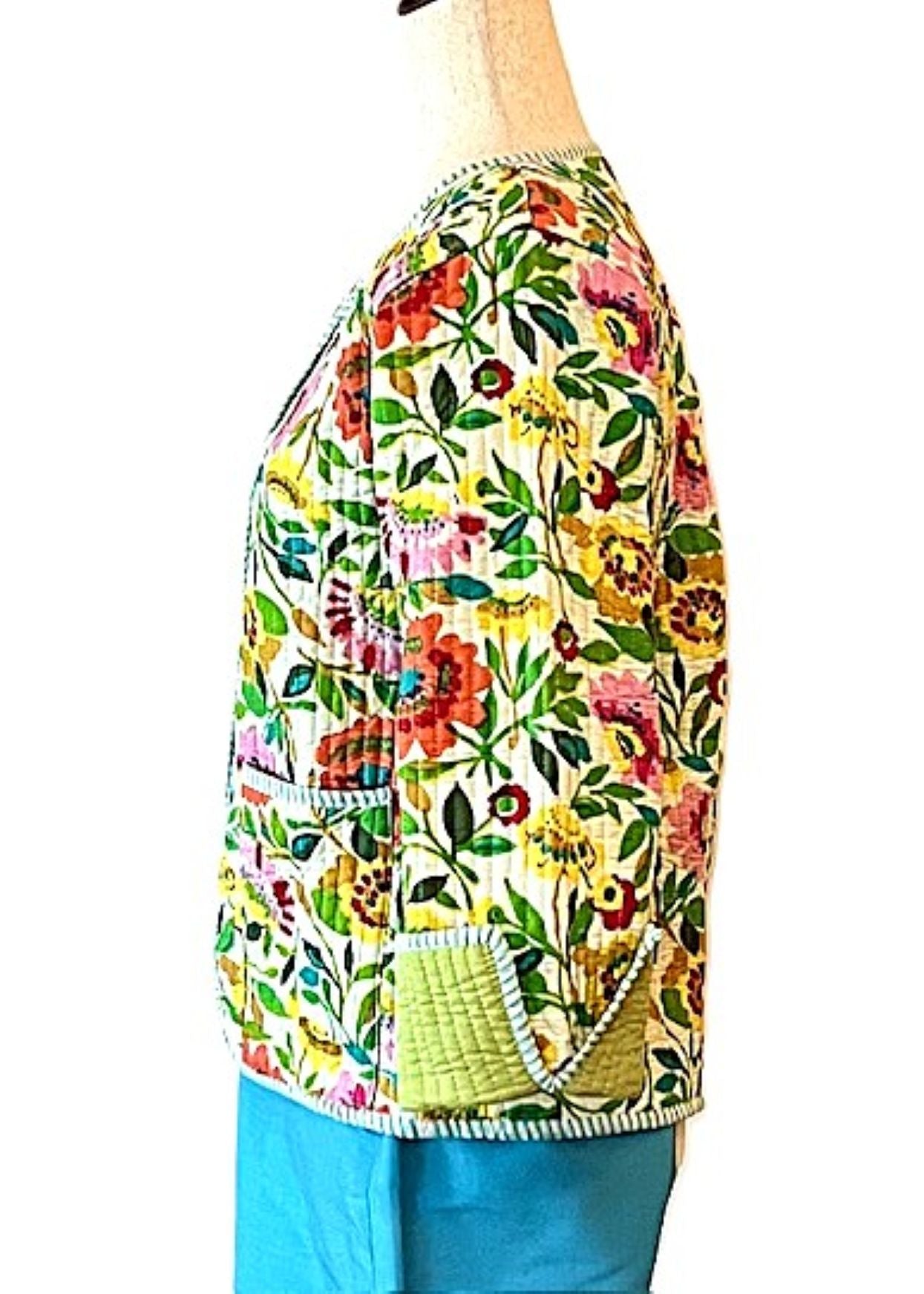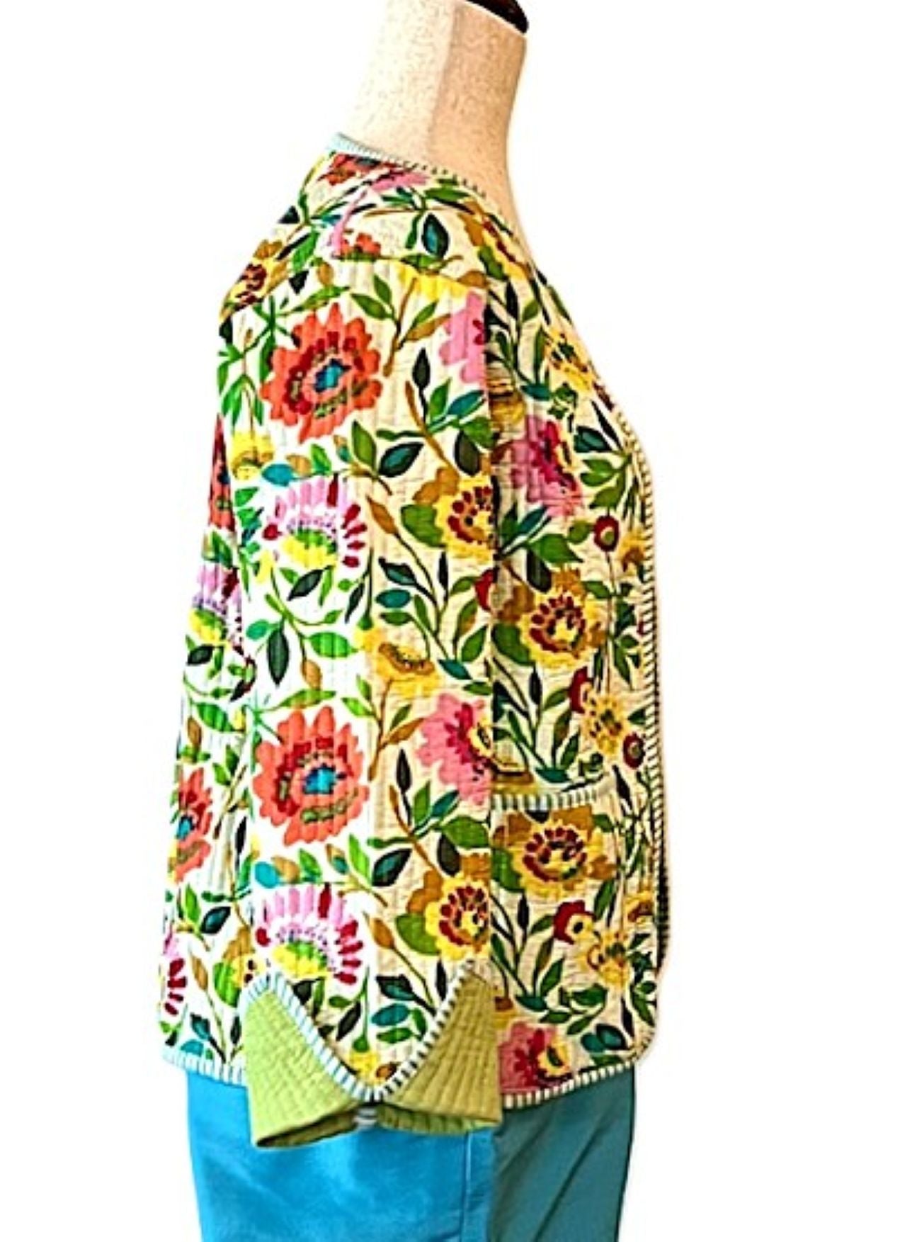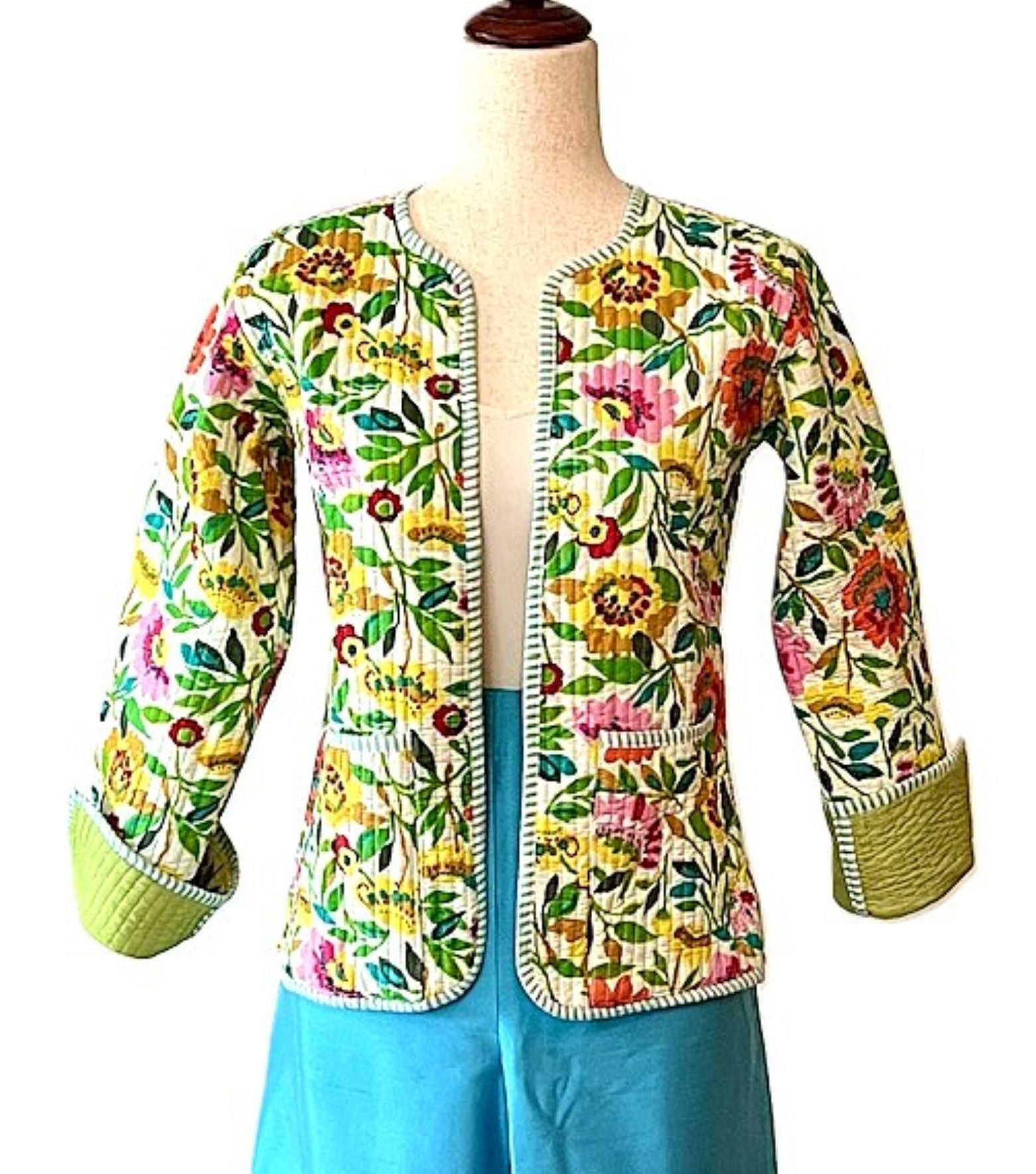 Reversible Cotton Quilted Womens Jacket Comes Alive In This Beautiful Garden Print. Fully reversible in lime green, handmade, quilted, button down front. Styled in a short blazer jacket resting just below the waist. Long sleeves with split seam, fold back to expose the cute piping, adjusting the sleeve length. Nice designer detailing. This vibrant print is beautiful and colorful. The reverse side is solid lime with quilting. This garden print will go with all of your coordinates. The reverse side is smart and tailored, quilted. Nice balance between the two prints.