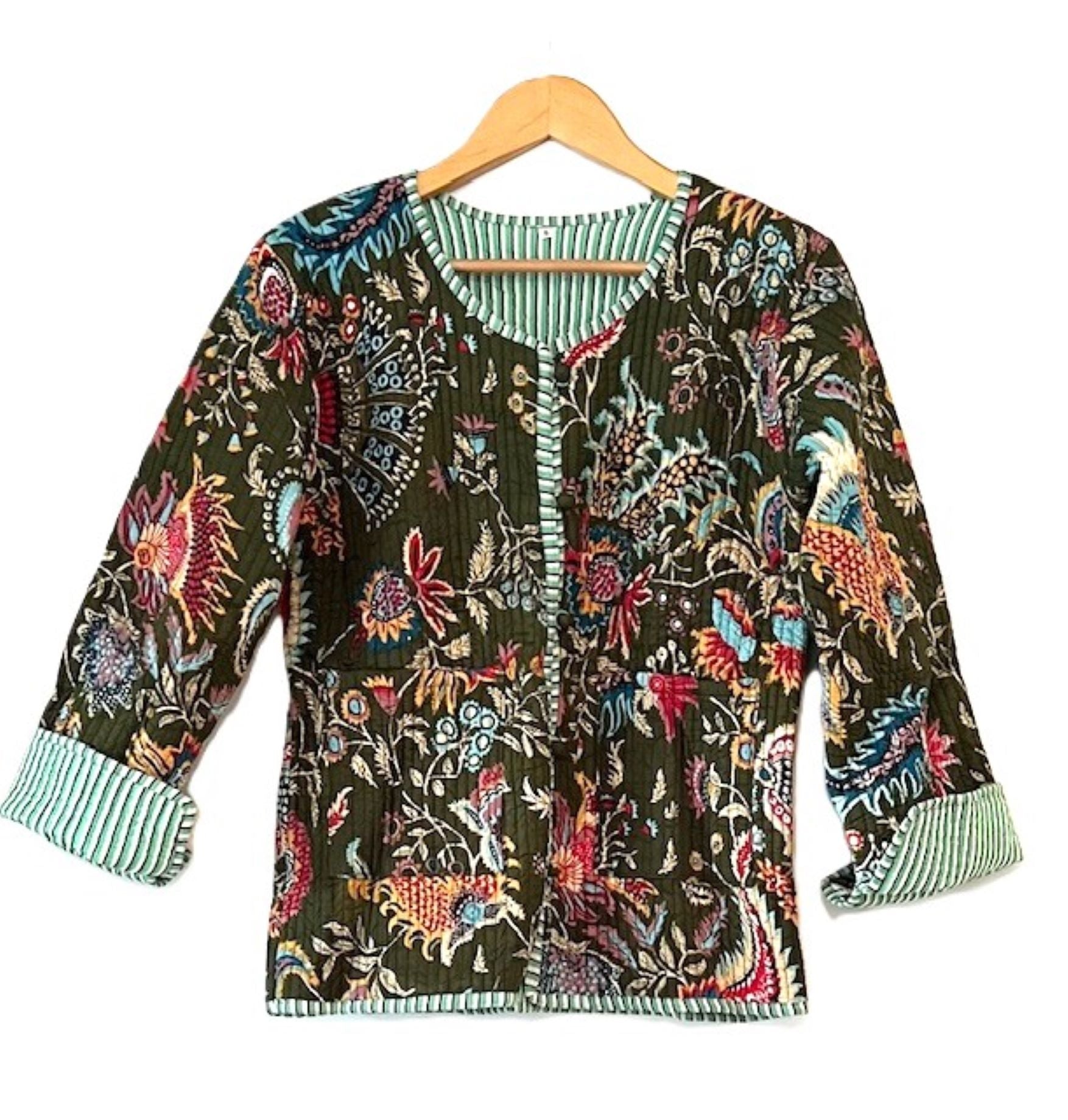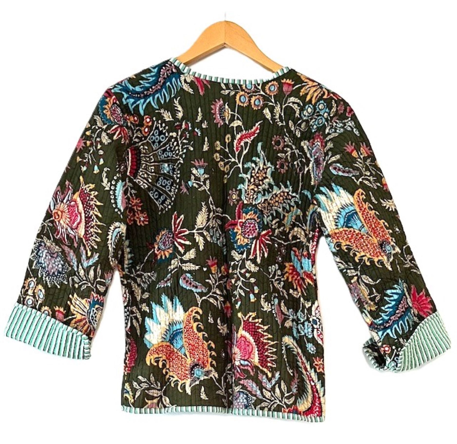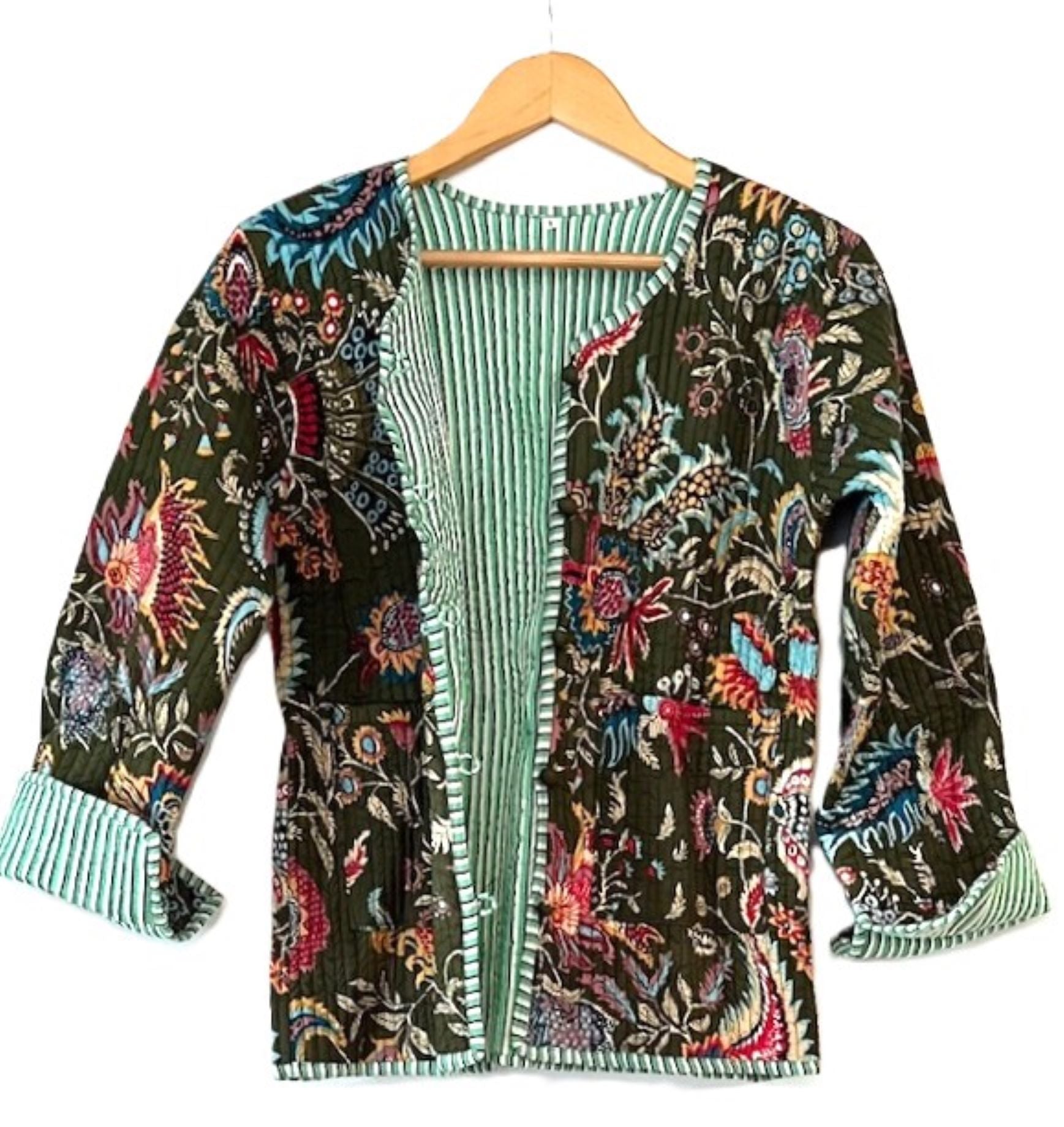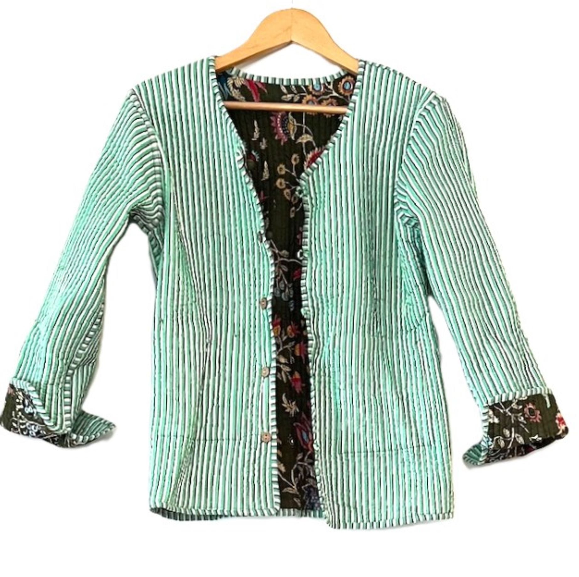 Fully Reversible Cotton Quilted Womens Jacket With Stripe Piping is adorable. Bold and vibrant botanical pattern, beautiful, incorporating all the primary colors. Handmade and quilted, button down front. Styled as a short blazer jacket resting just below the waist. Long sleeves with split seam, fold back to expose the cute piping, adjusting the sleeve length. Nice designer detailing.