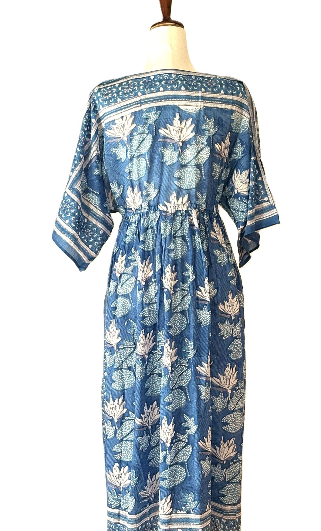 Japanese Style Border Print Float With A Drawstring Waist. Perfect for entertaining, resort, and lounging. Tailored, feminine, and slimming. Exceptional handmade block print in blue with a border print emphasizing the shoulders, sleeves and back panel. Covered tunnel empire tie adjusts to your body dimensions. V-neck, 3/4 sleeves, maxi length. Flattering cut. Classic silhouette that remains one of the top styles for resort and beach wear. Suitable for dining in or out, resort wear, and at-home leisure wear. Gorgeous as a swim cover up or as perfect poolside lounger. Perfect for lounging and also gift giving.