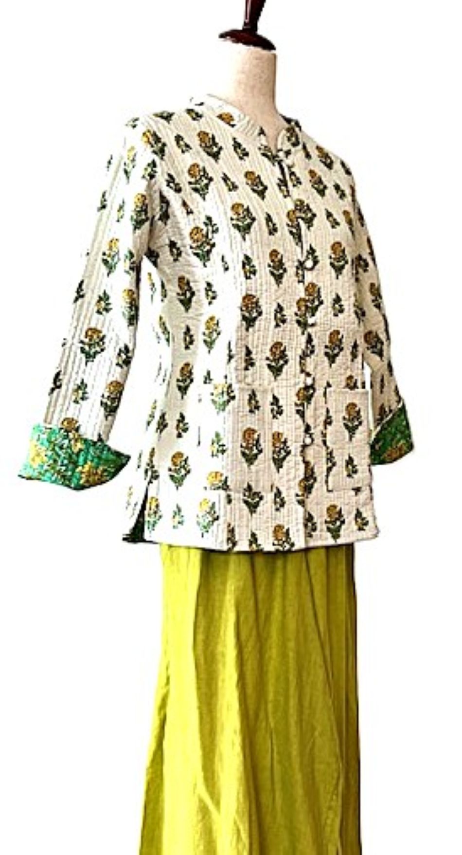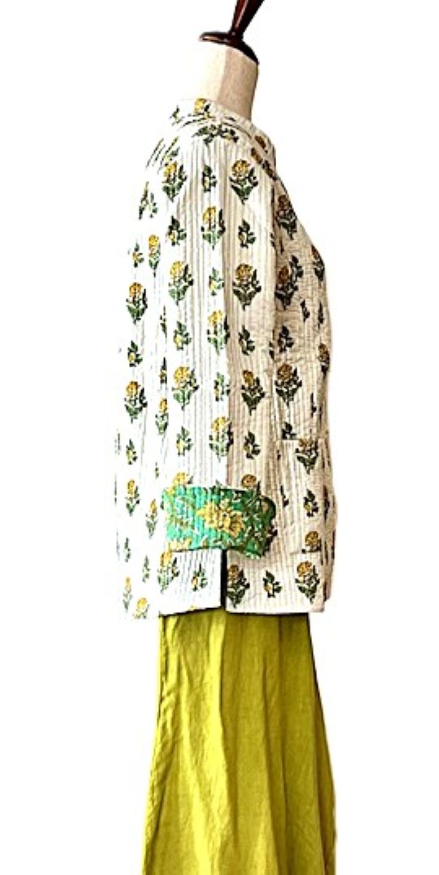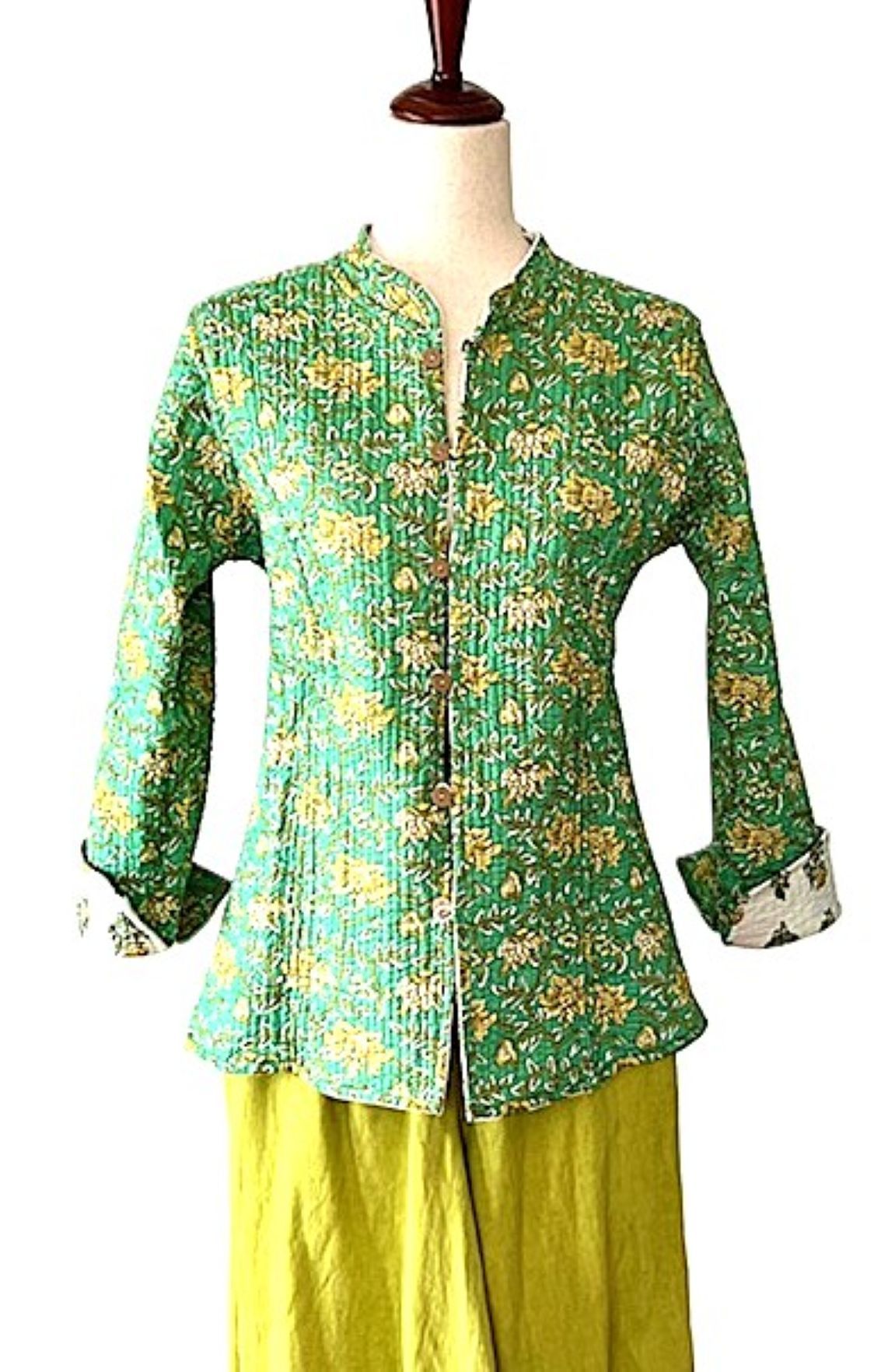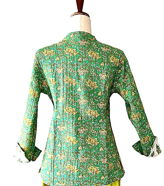 Cotton Quilted Womens Jacket with a mandarin tab collar is striking. This reversible cotton quilted jacket looks so rich in lush tones of green, white, khaki, and yellow Each side displays an engineered spacial pattern. The reverse side is a mini print in the same colors. Handmade, quilted on new cotton, with covered buttons down front. Split cuff may be folded back to expose the reverse side and also adds interest. Beautiful. Styled in a short blazer jacket resting at the hips. Long sleeves with split seam, fold back to expose the mixed print adjusting the sleeve length. Nice designer detailing. 100% soft, new cotton. Traditional sizing. Year round use, day into evening conversion is a breeze.
