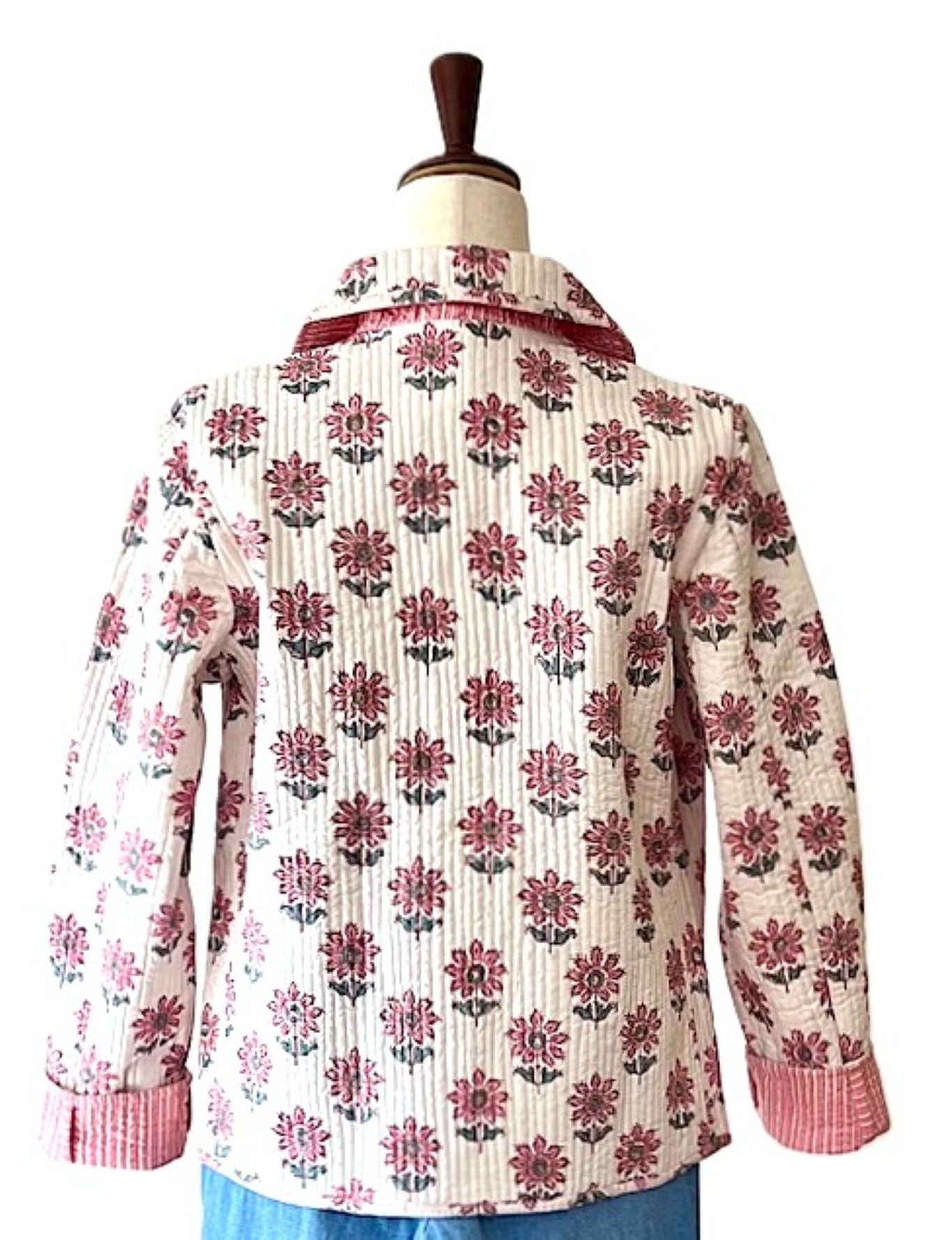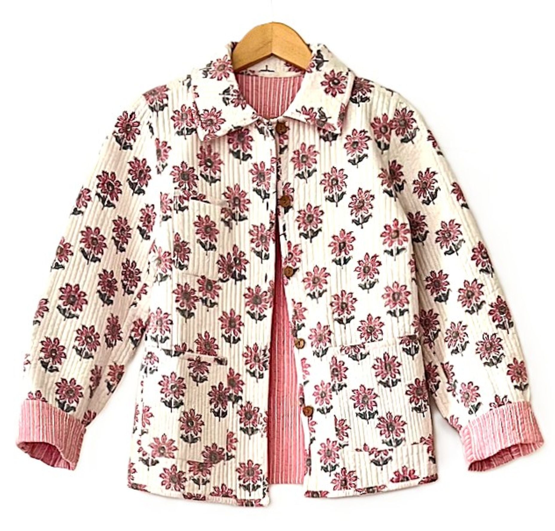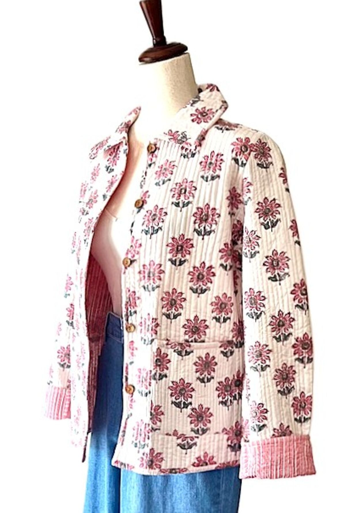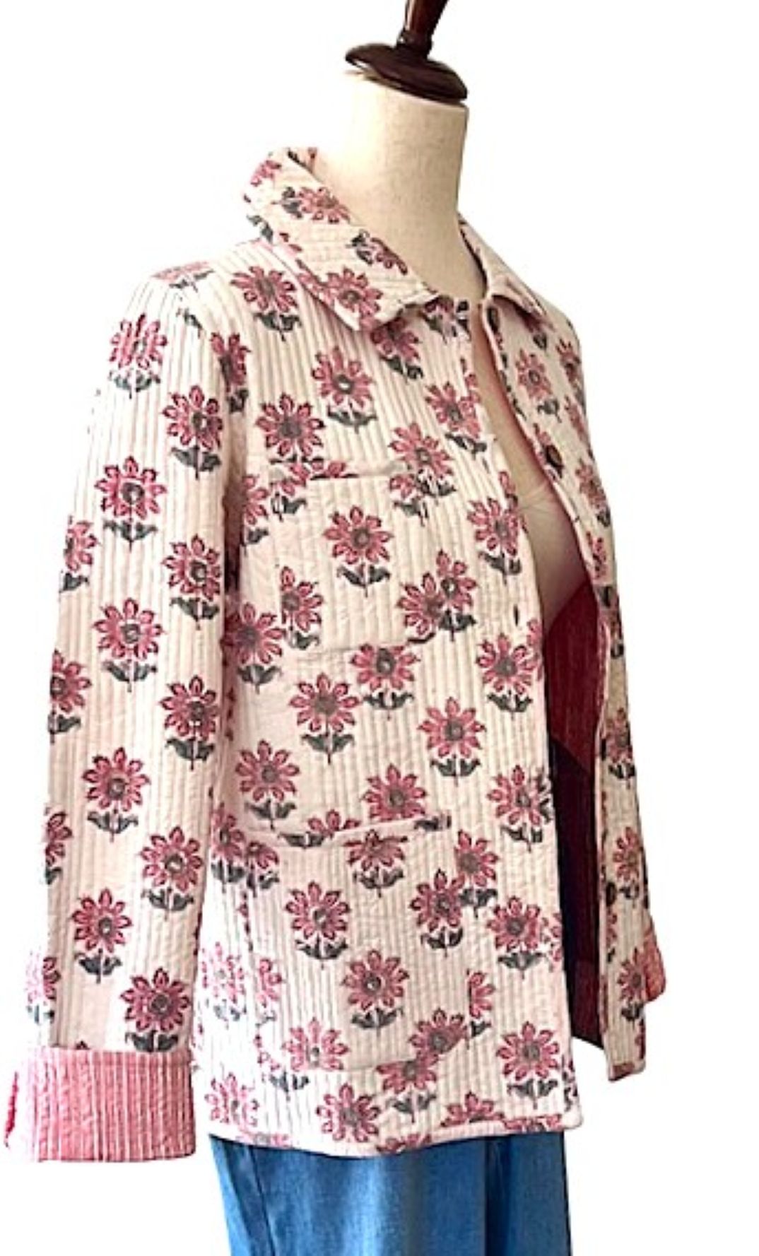 Reversible Cotton Quilted Women's Jacket with Stripe Piping is adorable. Lots of upgrades and changes. Handmade, quilted, patchwork pattern, button down front. Styled in a short blazer jacket resting just below the waist. We love the new color but just as good is the floral design. Linear pattern elongates the silhouette. Long sleeves with split seam, fold back to expose the cute piping, adjusting the sleeve length. Nice designer detailing. Each jacket is unique and one-of- a- kind.