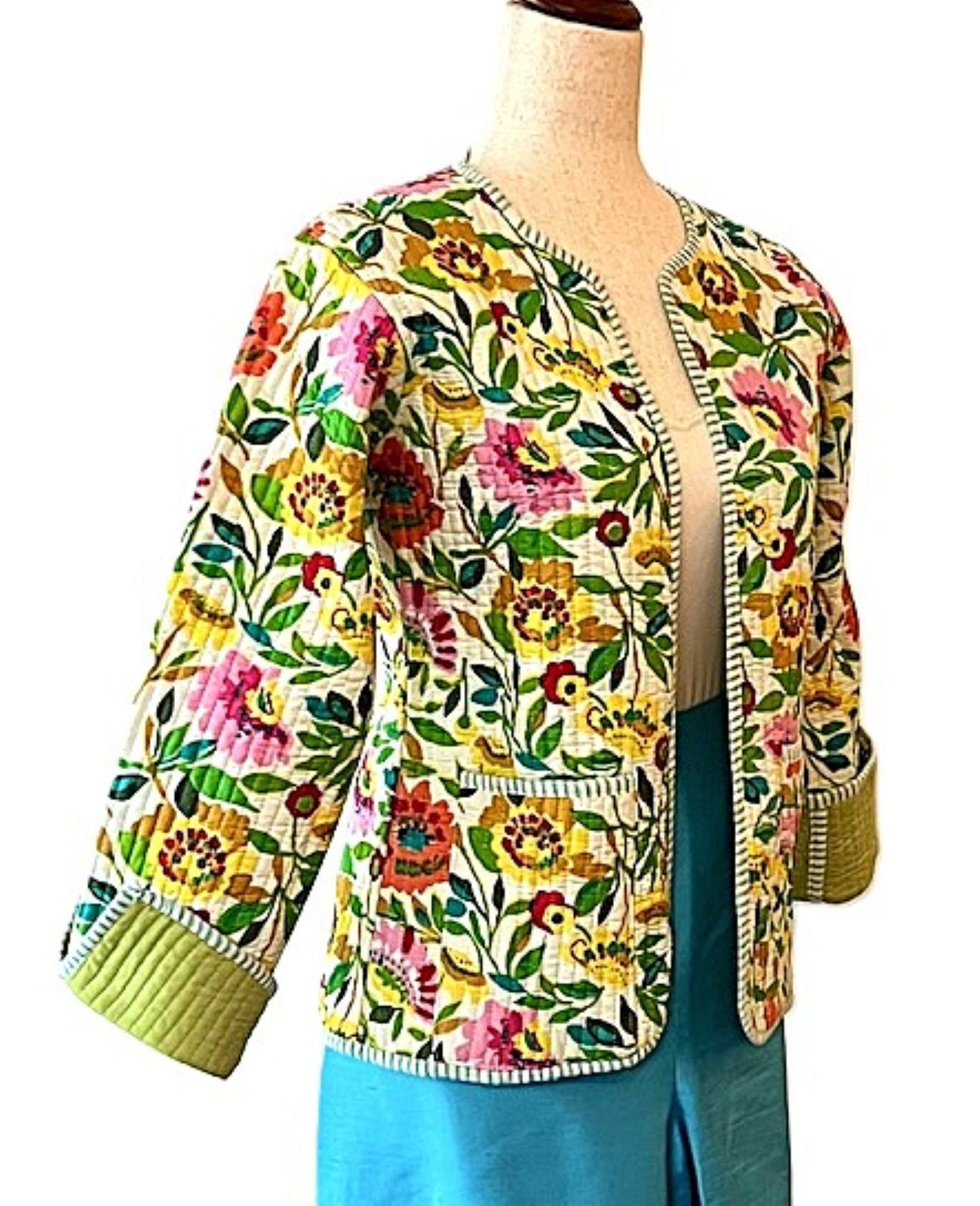 Luxe Cotton Quilted Handmade Open Jacket, (Green Florals)