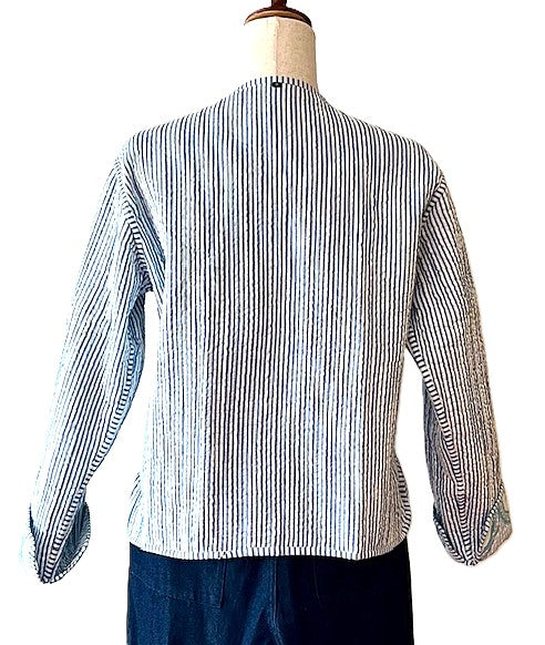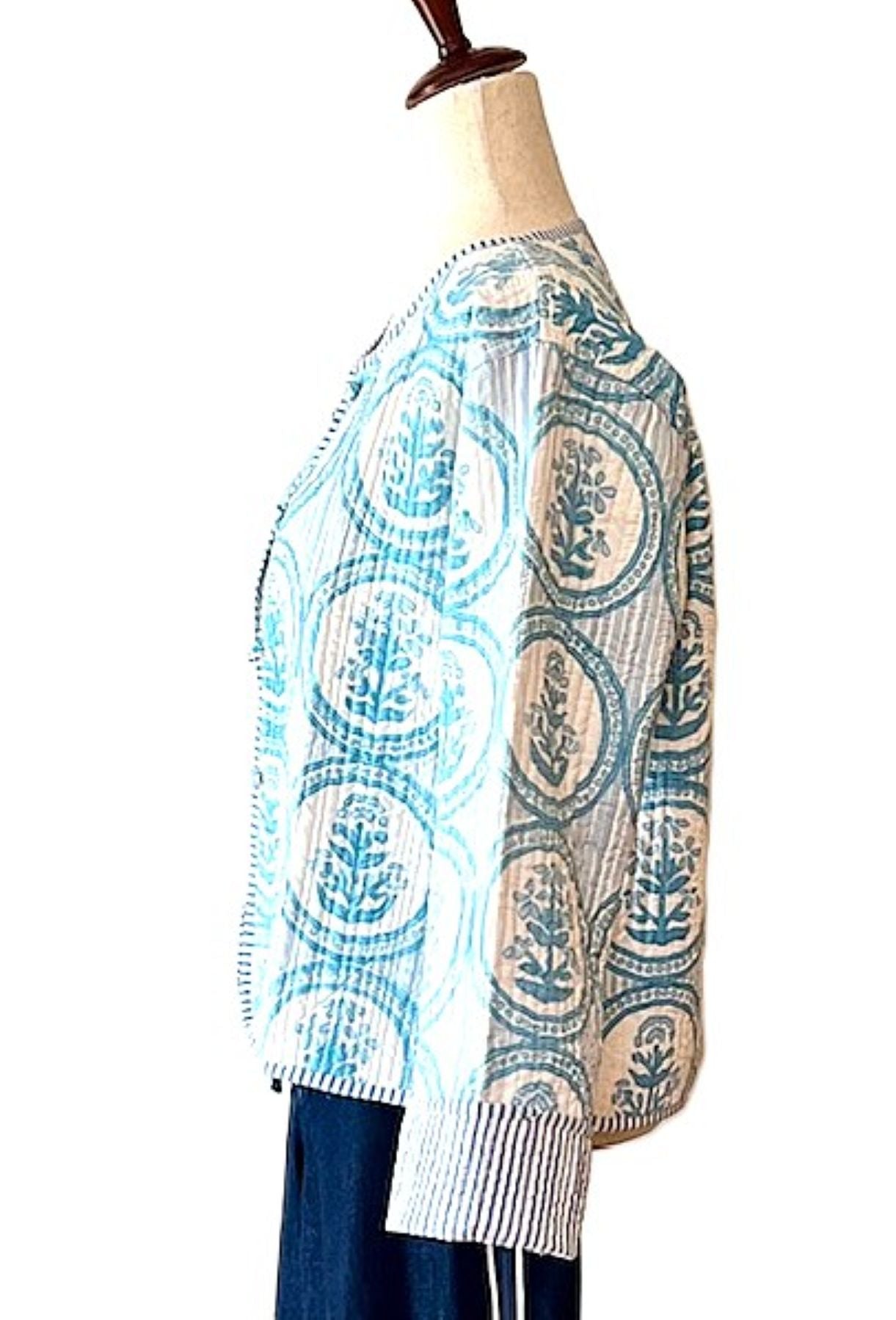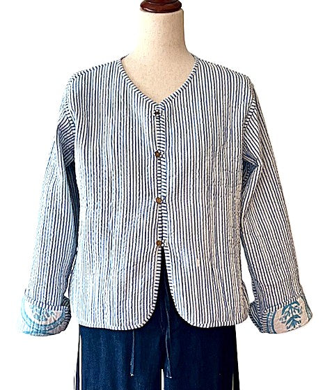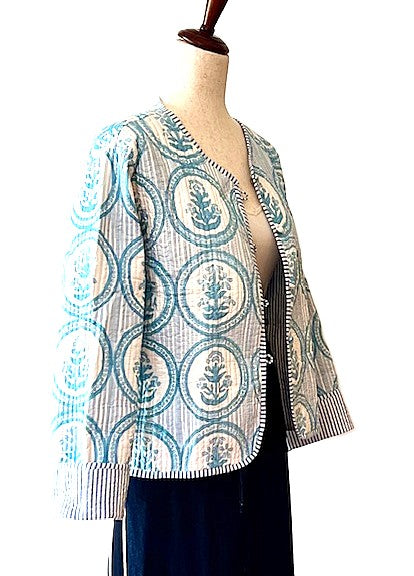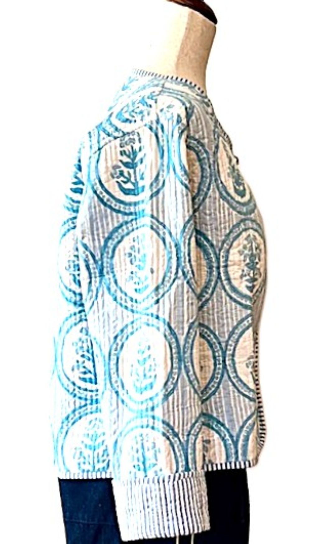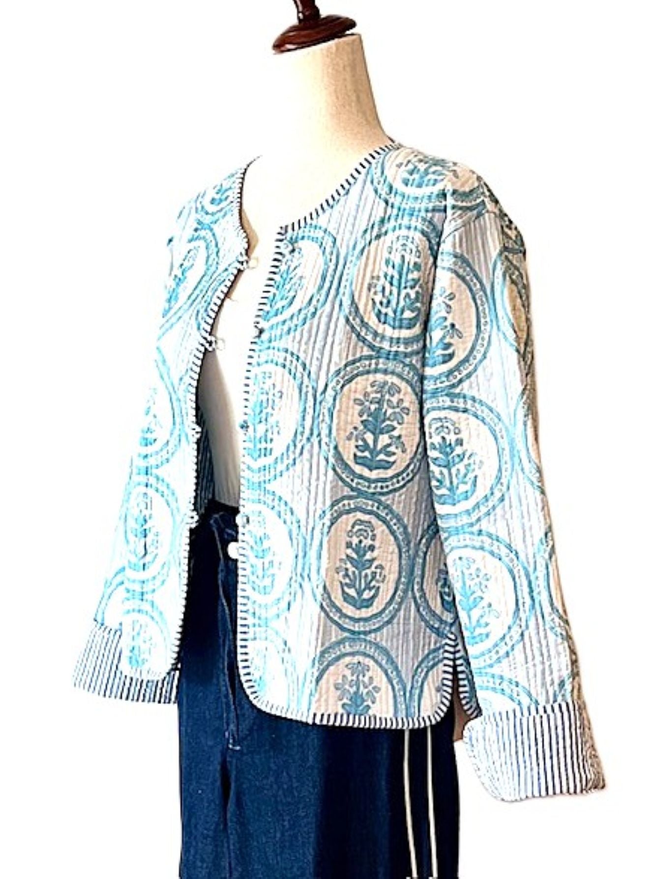 Short Cotton Quilted Handmade Jacket, Fully Reversible is fresh and new in light blue and white. Handmade, block printed, quilted, abstract pattern and covered buttons down the front. Styled in a short blazer jacket resting just below the waist. Long sleeves with split seam, fold back cuffs exposing the reverse print in a light blue and white stripe. Fully reversible. The reverse side has lovely wooden buttons. Nice designer detailing.